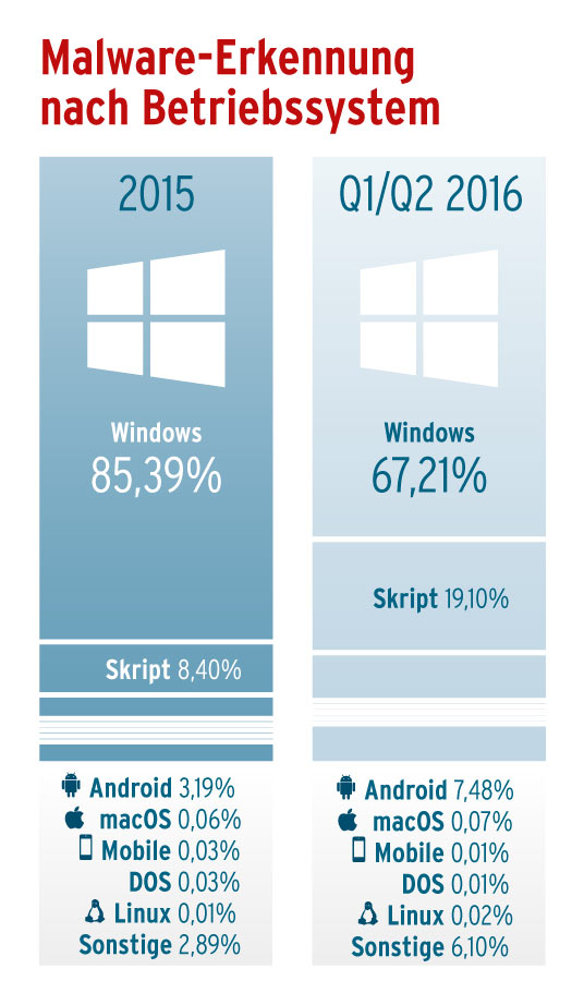 Bei Malware-Attacken auf Windows-Nutzer setzten kriminelle Angreifer 2015 besonders häufig Internetwürmer ein. Über ein Drittel aller Malware-Erkennungen entfiel auf diese Schädlingsgattung. An zweiter und dritter Stelle folgten klassische Computer-Viren sowie das große Heer spezialisierter Trojaner, darunter Banking-Trojaner und die 2015 weit verbreitete Ransomware. In diesem Jahr änderten die Kriminellen ihre Strategie und bauten bei ihren Angriffen bisher vermehrt auf Viren und Trojaner. So nimmt allein die Viren-Verbreitung um 19 Prozent zu.