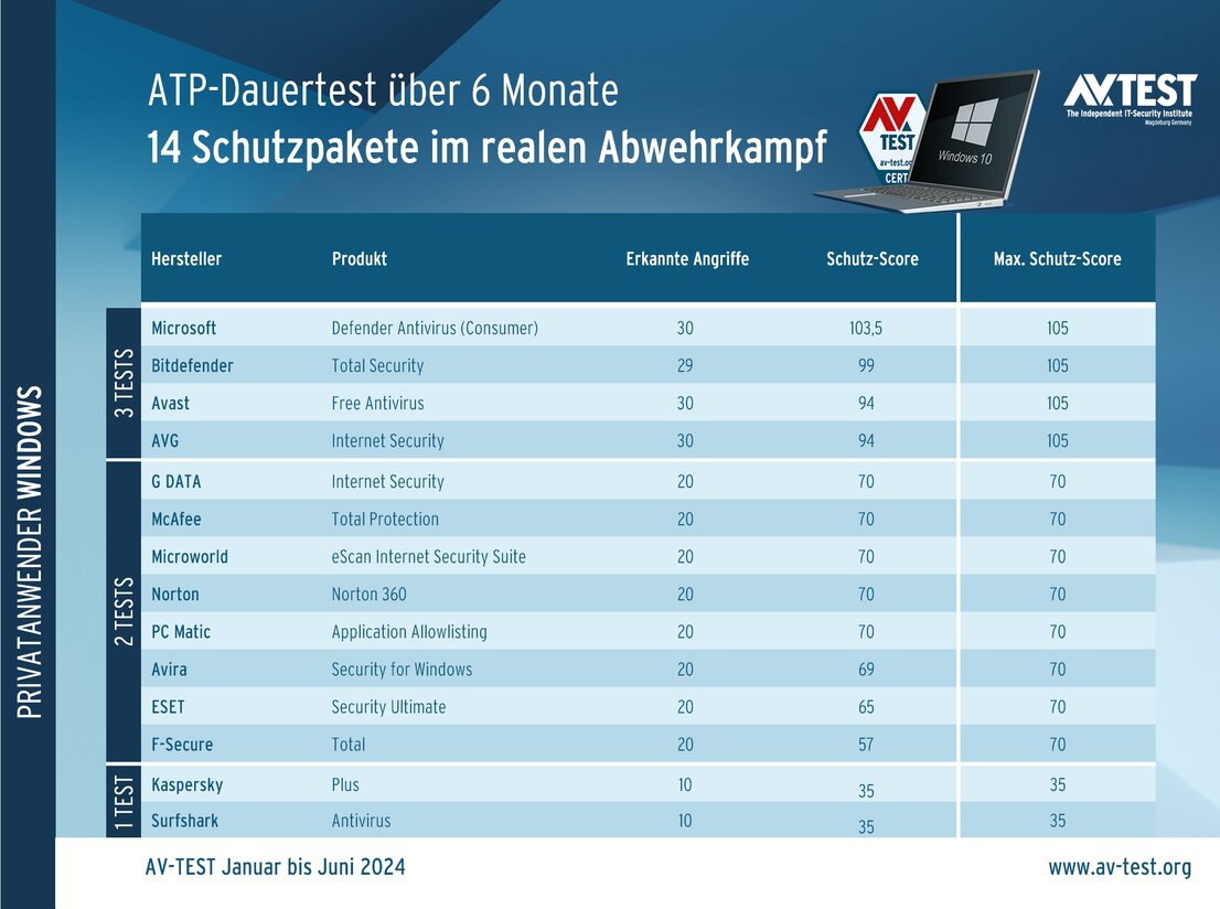 Die Zusammenstellung der Tests zeigt, wie gut und beständig die Produkte die privaten Nutzer oder Mitarbeiter in Unternehmen schützen. Das zeigen besonders gut die Gruppen mit 3 Tests über 6 Monate hinweg. Dort überrascht bei den privaten Nutzern der Windows-interne Defender Antivirus mit 103,5 von 105 Punkten. Mit geringem Abstand folgen die Schutzpakete von Bitdefender, Avast und AVG mit 99 und 94 Punkten.