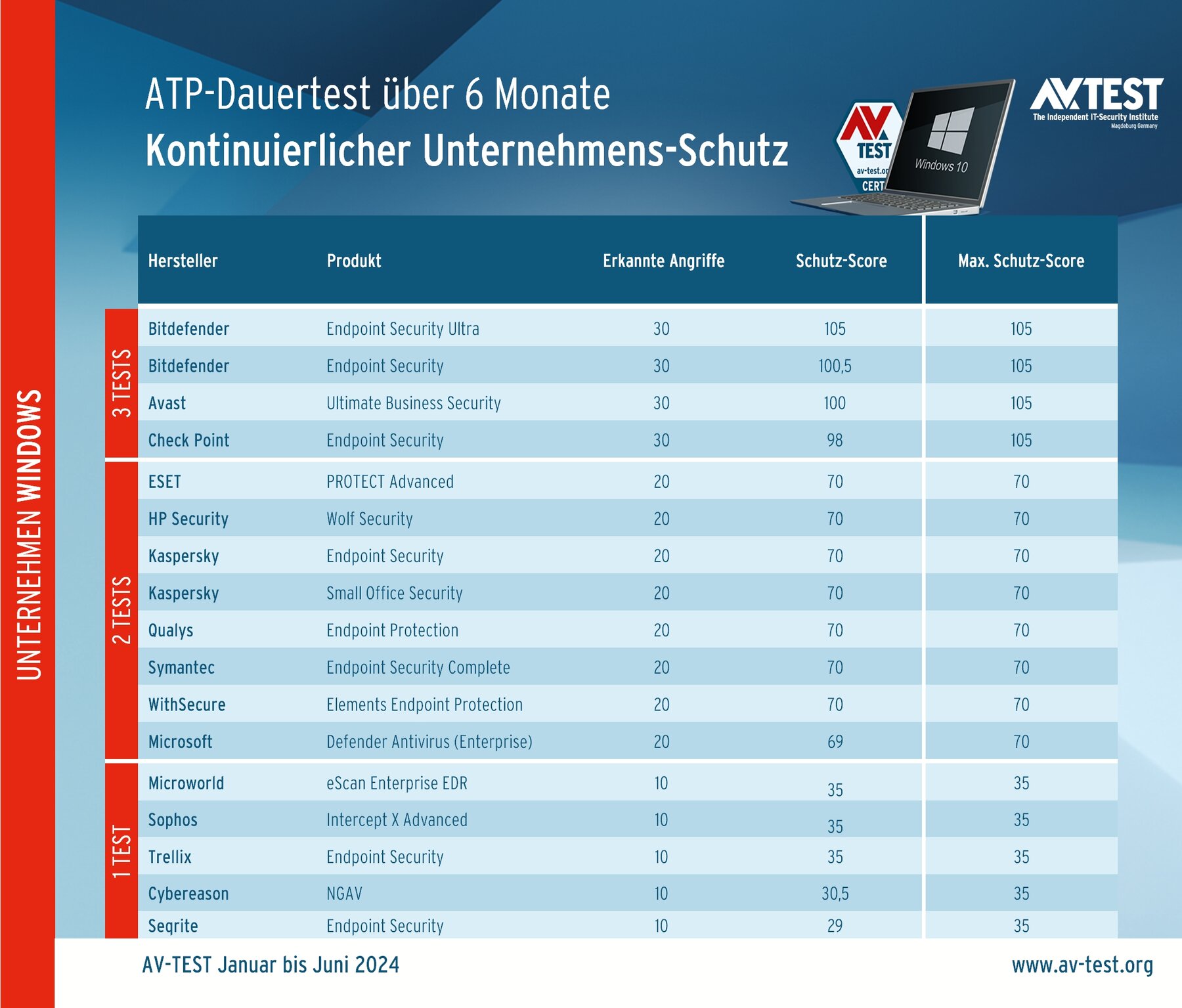 In der Gruppe der Lösungen für Unternehmen mit 3 Tests nimmt Bitdefender Endpoint Security Ultra eine herausragende Rolle ein: es ist das einzige Produkt im ATP-Dauertest, welches 105 von 105 Punkten erreicht. Gleich darauf folgt die zweite Bitdefender-Version ohne Ultra mit 100,5 Punkten von maximal 105. Aber auch Avast und Check Point brauchen sich mit ihren 100 bzw. 98 Punkten nicht zu verstecken.