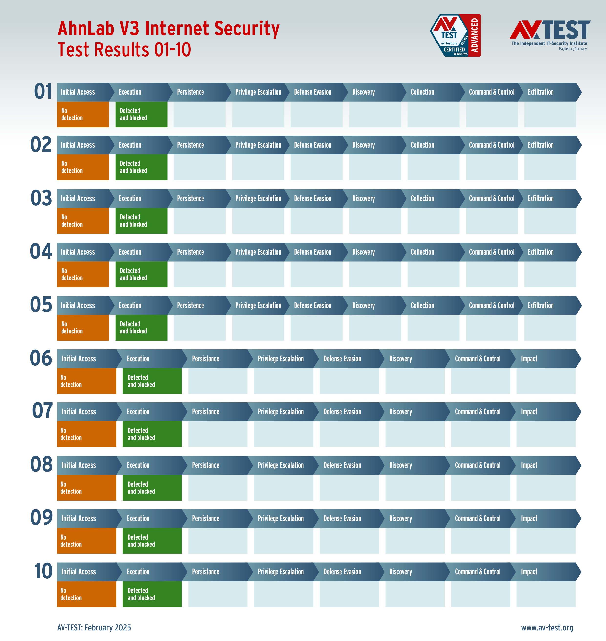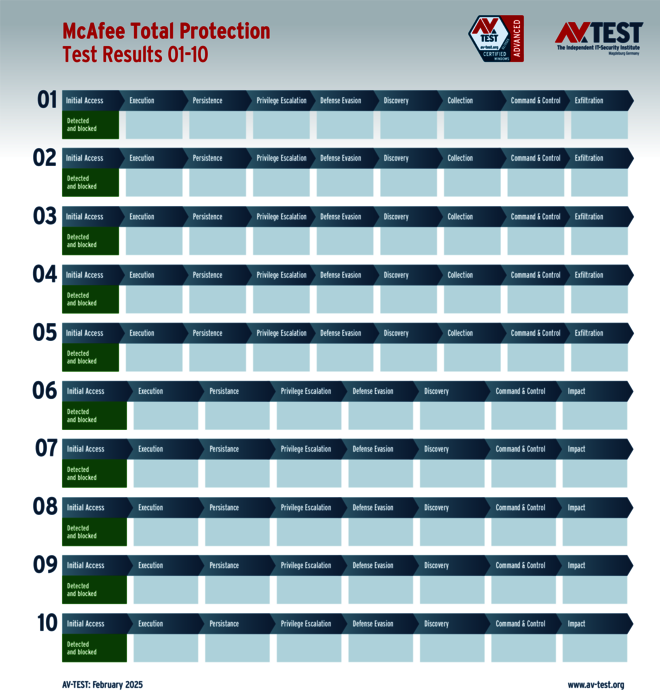 Ausnahmslos alle Angreifer der 10 Szenarien wehren die Produkte von AhnLab, Avast, AVG, Bitdefender, F-Secure, McAfee und Norton ab. Sie erhalten die vollen 35 Punkte.