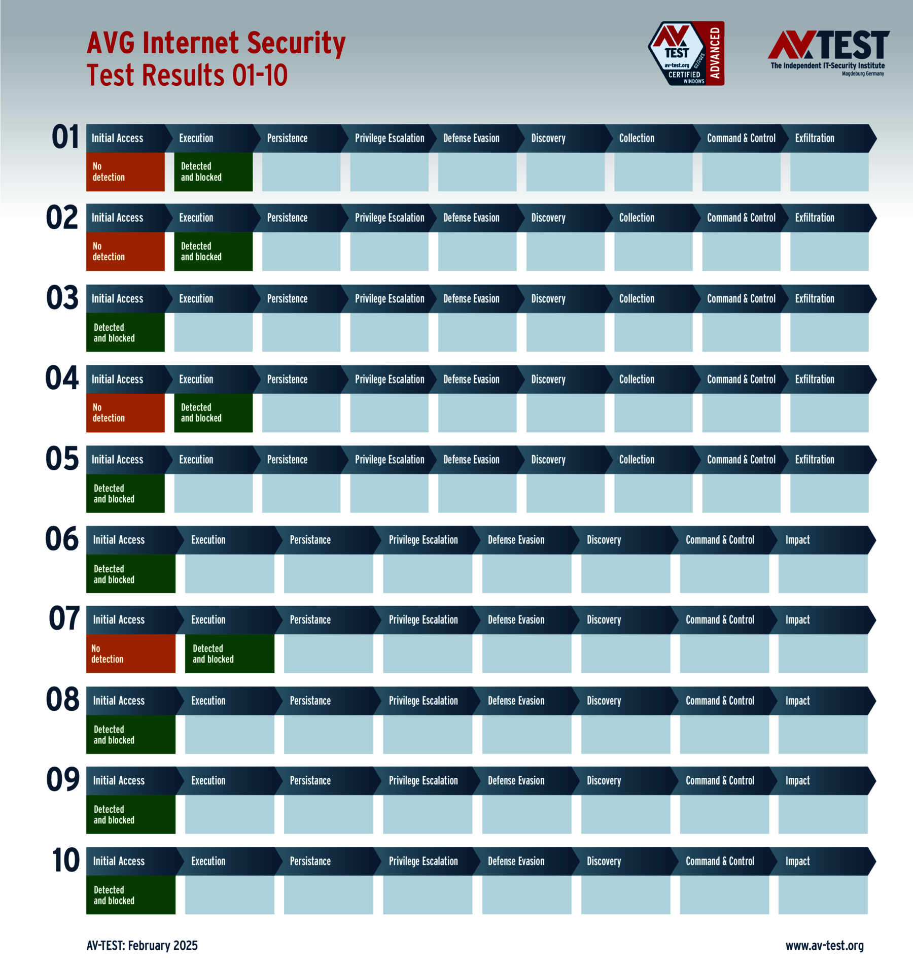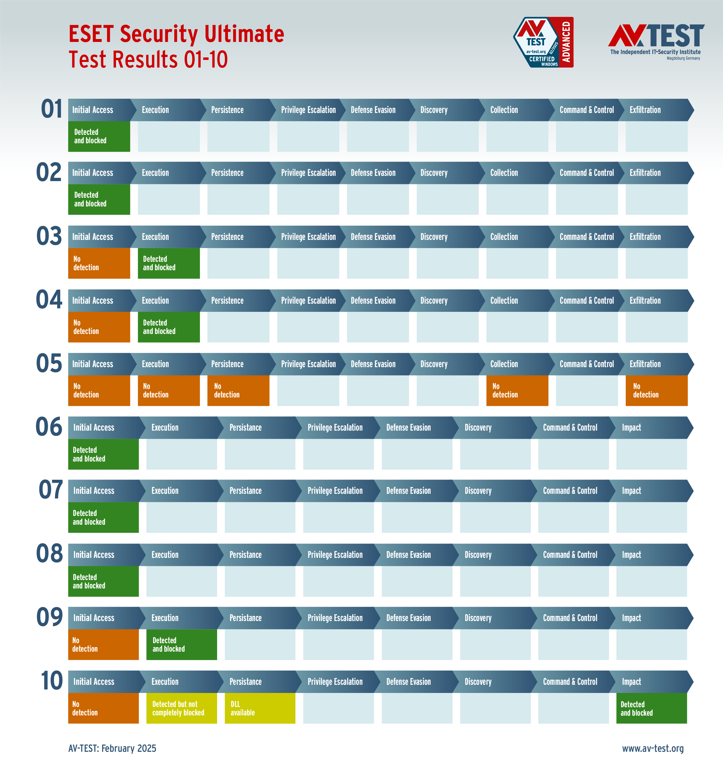 Auch ESET kann einen Infostealer weder erkennen noch aufhalten und verliert somit alle 4 Punkte. In einem weiteren Fall mit einer Ransomware misslingt die Erkennung ebenfalls, allerdings greifen weitere Schutzmaßnahmen und der Angriff ist gestoppt. Dafür verliert ESET aber noch einmal einen Punkt. Als Endergebnis bleiben so 30 von 35 Punkten.