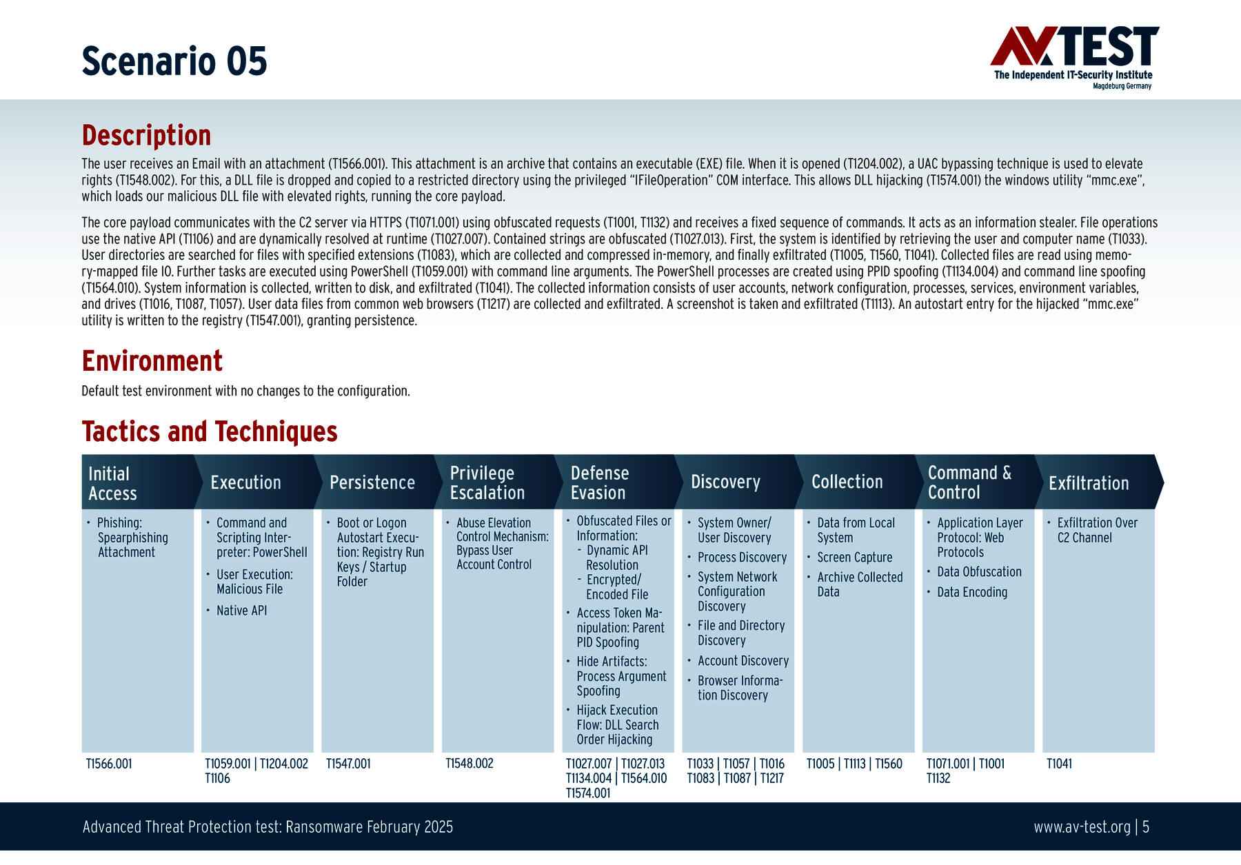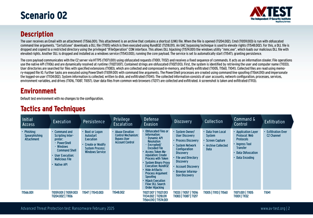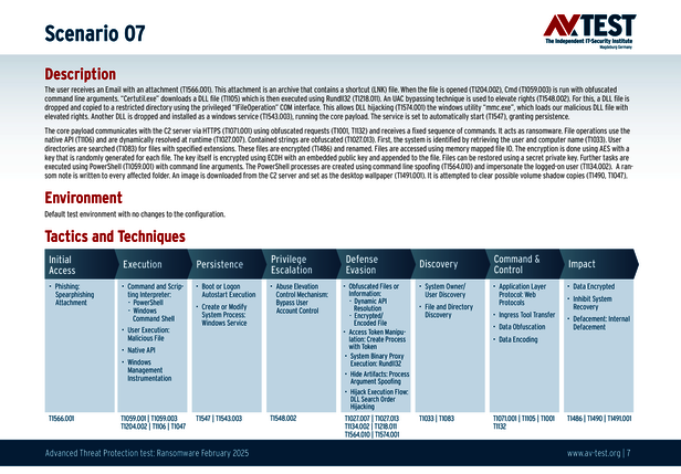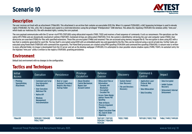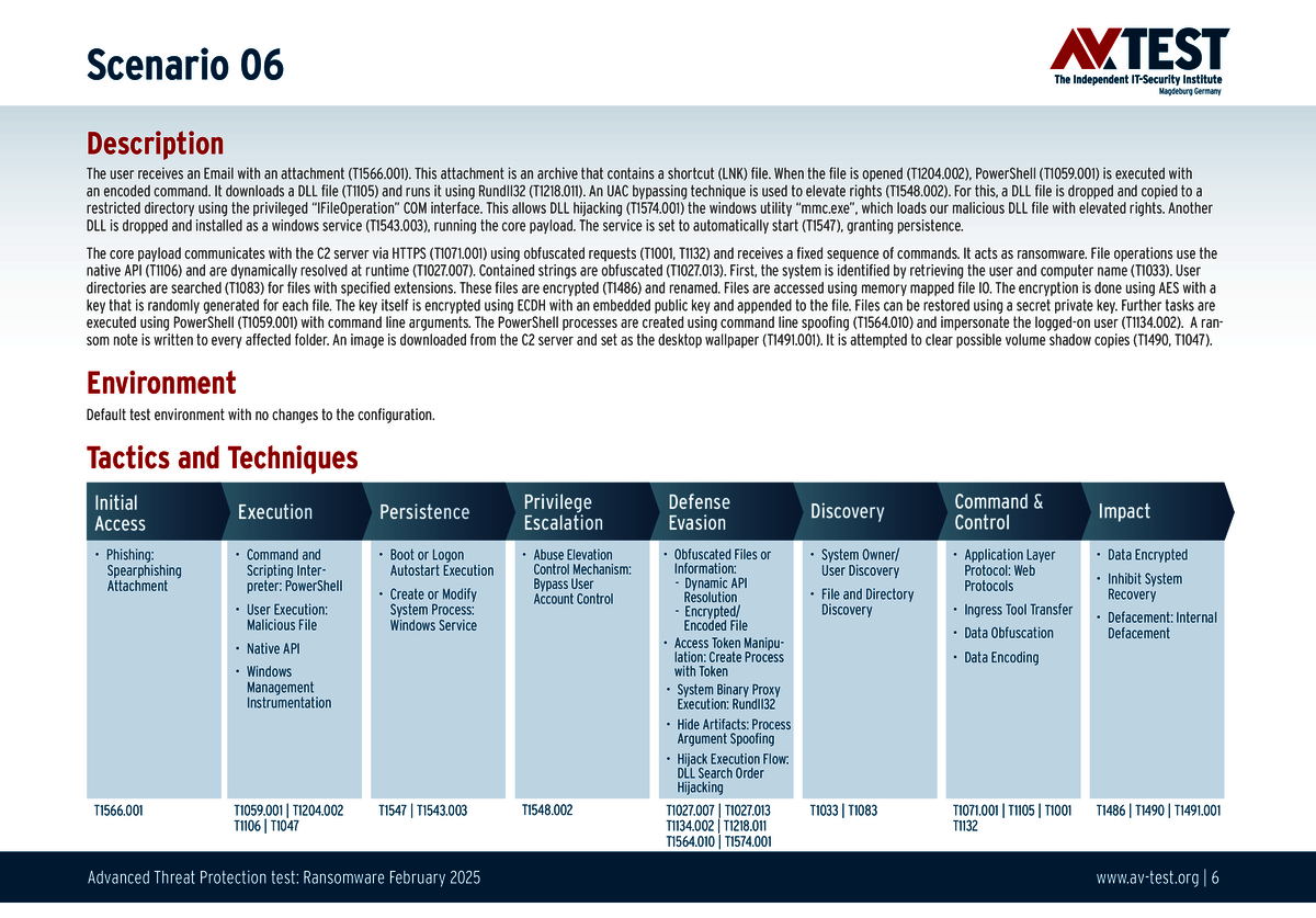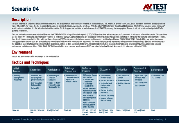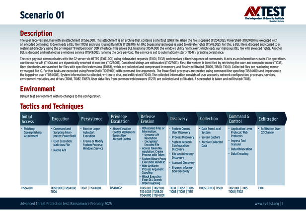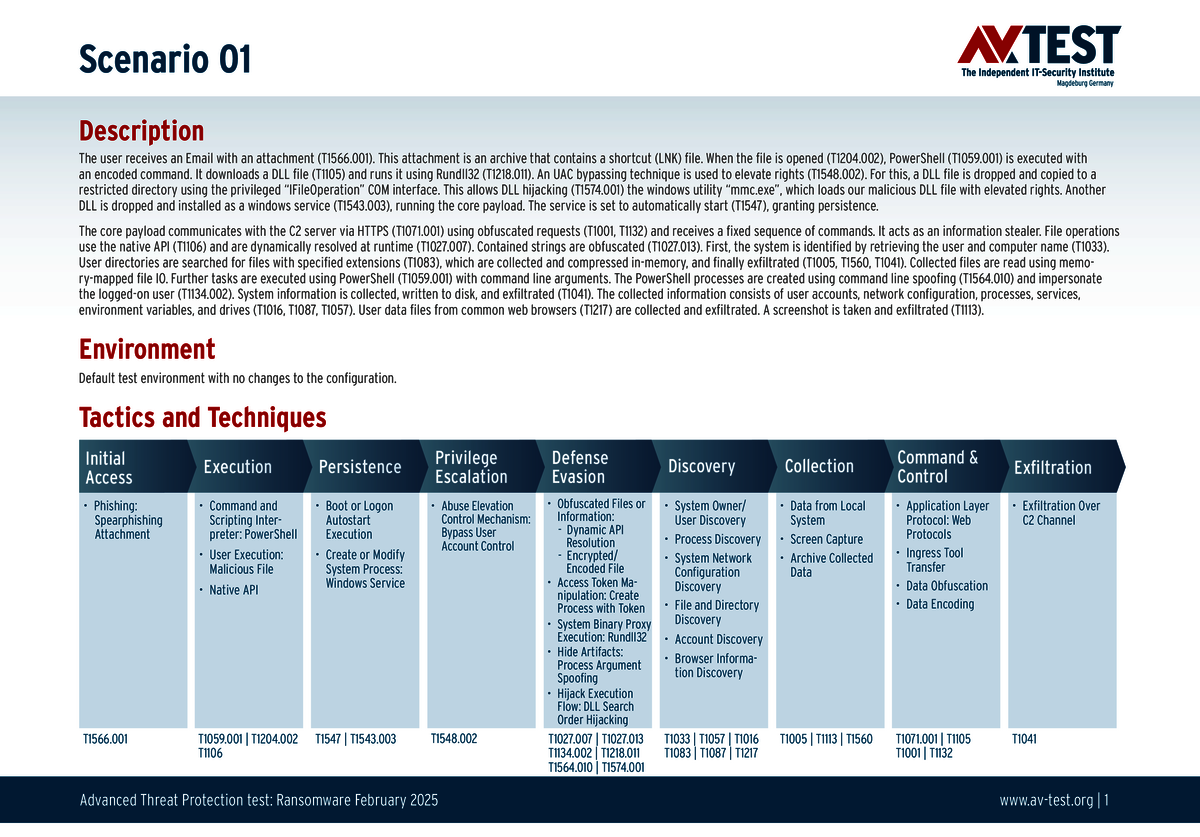 Alle Angriffsszenarien sind dokumentiert nach dem Standard der MITRE ATT&CK-Datenbank. Die einzelnen Unterpunkte, z.B. „T1566.001,“ stehen in der MITRE-Datenbank für „Techniques“ unter „Phishing: Spearphishing Attachment“. Jeder Testschritt ist so unter Fachleuten definiert und lässt sich nachvollziehen. Zusätzlich sind alle Angriffstechniken erklärt und wie dabei die Malware zum Zuge kommt.
