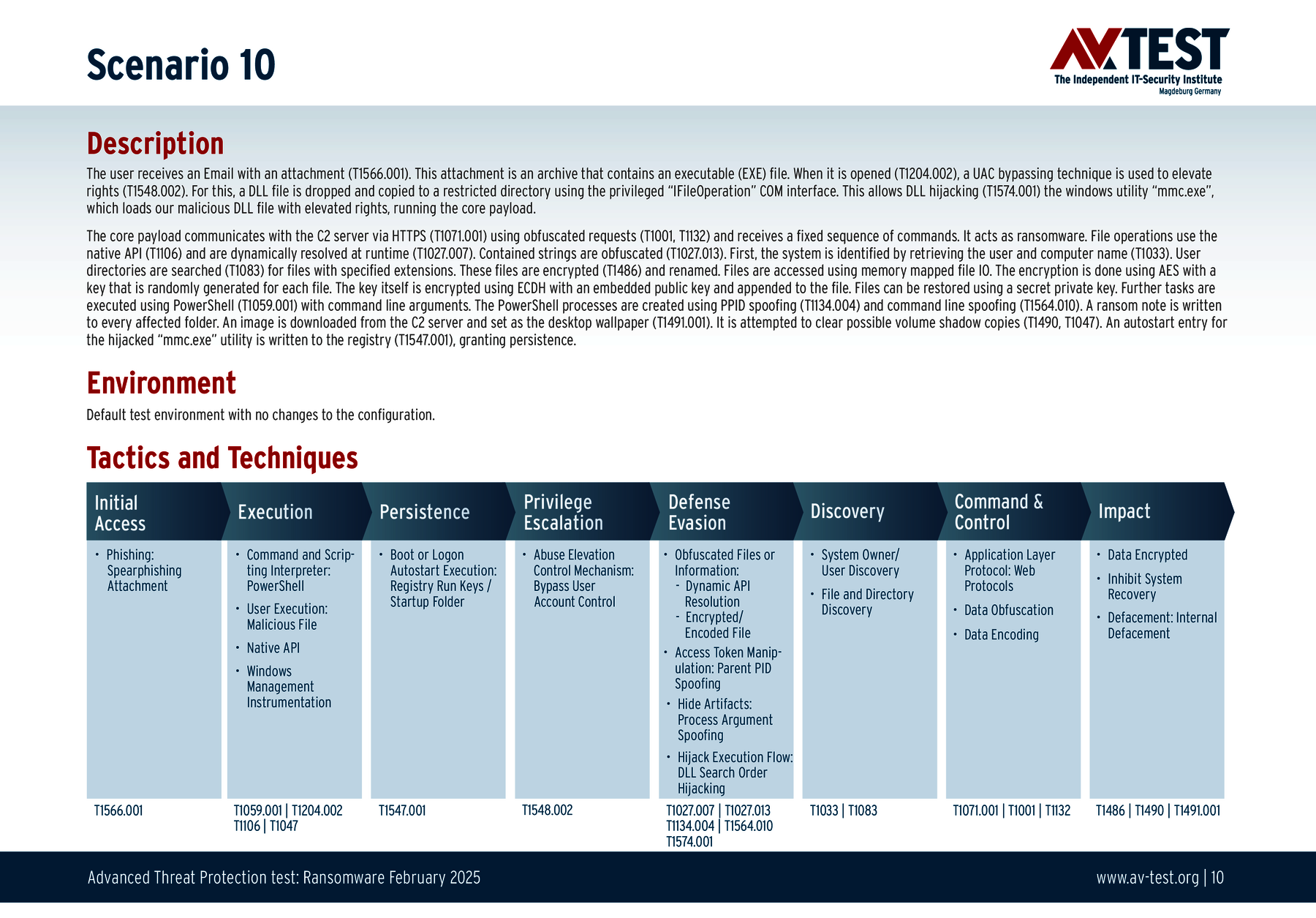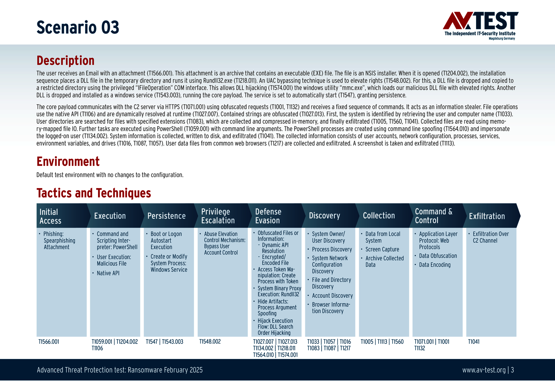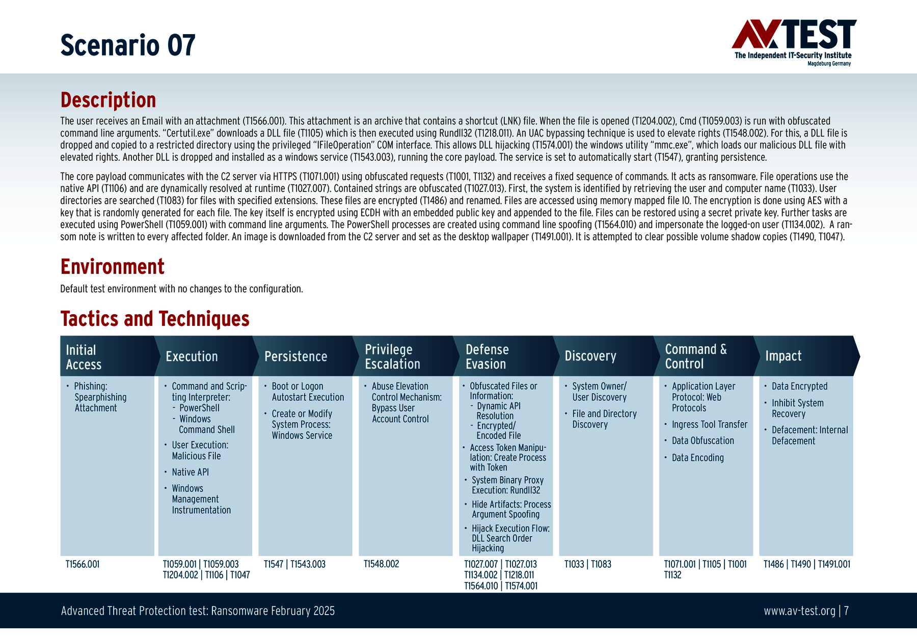 Alle Angriffsszenarien sind dokumentiert nach dem Standard der MITRE ATT&CK-Datenbank. Die einzelnen Unterpunkte, z.B. „T1566.001,“ stehen in der MITRE-Datenbank für „Techniques“ unter „Phishing: Spearphishing Attachment“. Jeder Testschritt ist so unter Fachleuten definiert und lässt sich nachvollziehen. Zusätzlich sind alle Angriffstechniken erklärt und wie dabei die Malware zum Zuge kommt.