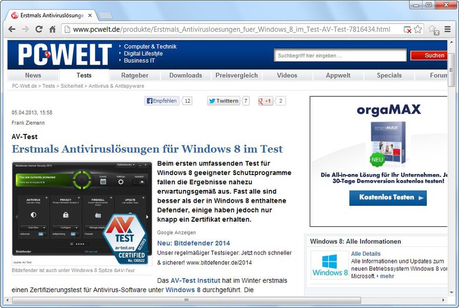 Test Windows 8 Antivirenlösungen für Unternehmen