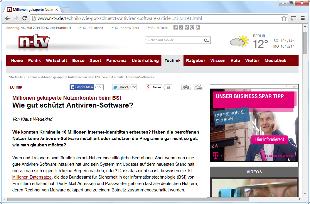 Viele Print- und Online-Medien zitieren jeden Monat die aktuellen Testergebnisse aus den Labors der AV-TEST GmbH. Oft nutzen sie die Testwerte der Sicherheitsexperten als Basisdaten für Produktvergleiche. Einige Magazine stellen aber noch andere interessante Marktvergleiche an, sprechen über die zukünftige Entwicklung von Antiviren-Software oder stellen Sicherheitskonzepte von Betriebssystemen in Frage. Hier eine kleine Sammlung von Veröffentlichungen.