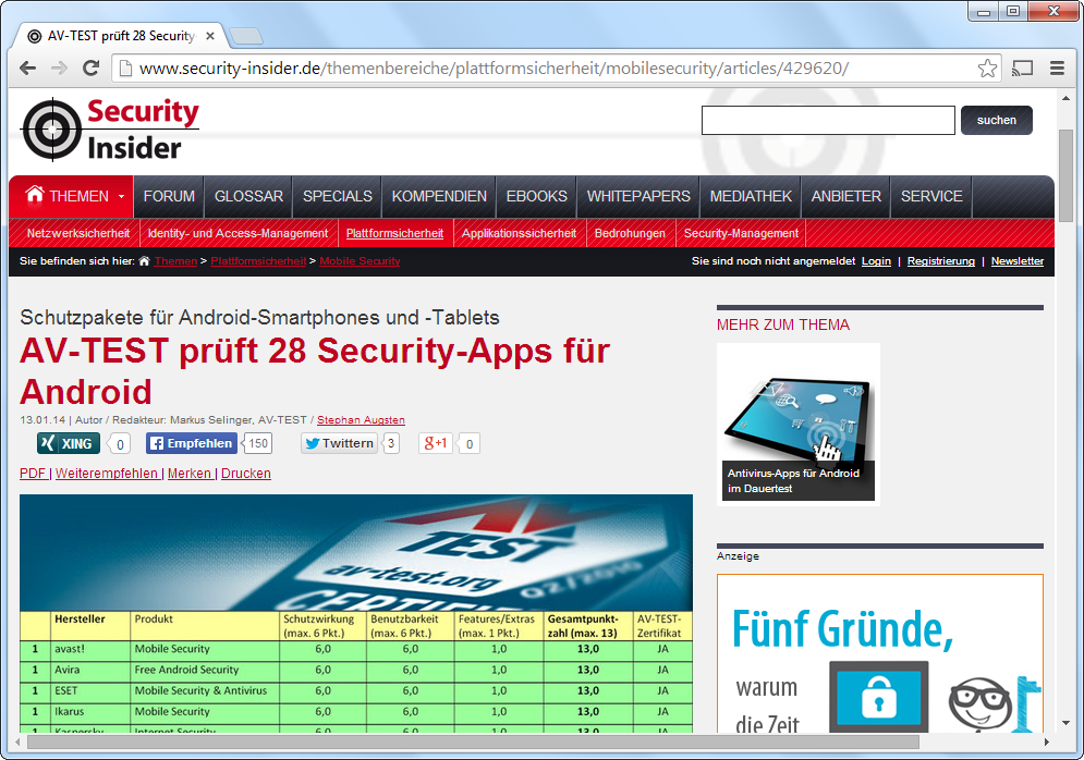 AV Test mit neuen Testergebnissen beim Virenschutz für Smartphones