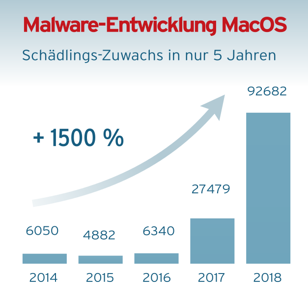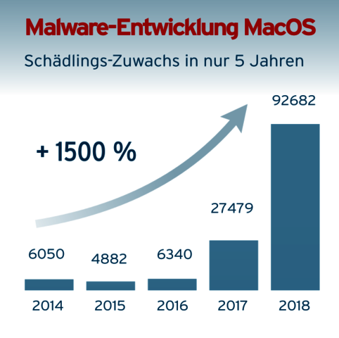 Das System MacOS gilt grundsätzlich als sicher gegen Angreifer. Allerdings muss auch Apple immer öfter eingestehen, dass die Systeme Sicherheitslücken haben und die Veröffentlichung von Updates gar Wochen und Monate dauern kann. Das wollen anscheinend auch die Schreiber von Malware ausnutzen. Die Anzahl der bei AV-TEST registrierten Schädlinge ist von etwa 27.000 im Jahr 2017 auf fast 93.000 im Jahr 2018 angewachsen. Das ist ein Anstieg von knapp 350 Prozent.