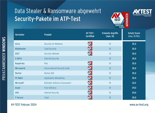 Das Labor hat bei 12 Endanwenderprodukten im erweiterten ATP-TEST geprüft, wie gut sie Data Stealer und Ransomware mit den neuesten Angriffstechniken erkennen und abwehren. Folgende Hersteller lieferten Produkte: Avast, AVG, Avira, Bitdefender, ESET, F-Secure, G DATA, Kaspersky, Microsoft, Microworld, Norton und PC Matic.
