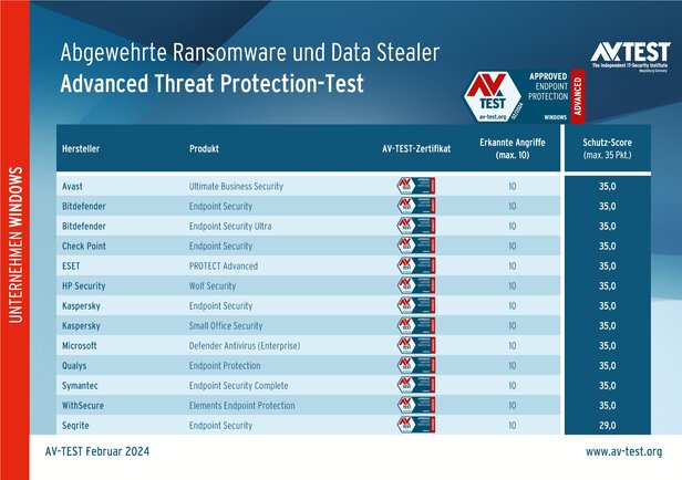 Als Unternehmenslösungen finden sich im Test die folgenden Endpoint-Produkte dieser Hersteller ein: Avast, Bitdefender (mit 2 Versionen), Check Point, ESET, HP Security, Kaspersky (mit 2 Versionen), Microsoft, Qualys, Seqrite, Symantec und WithSecure.