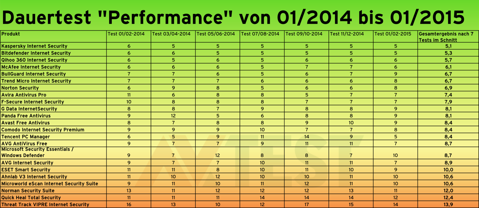 Den niedrigsten Einfluss und den damit besten Geschwindigkeits- bzw. Performance-Wert hat das Produkt von Kaspersky mit nur 5,1 Belastungspunkten. Wie bereits erwähnt liegt der maximal erreichbare Bestwert bei 5,0 Punkten. Dicht dahinter finden sich die Schutzpakete von Bitdefender und Qihoo 360 mit 5,3 bzw. 5,7 Punkten.