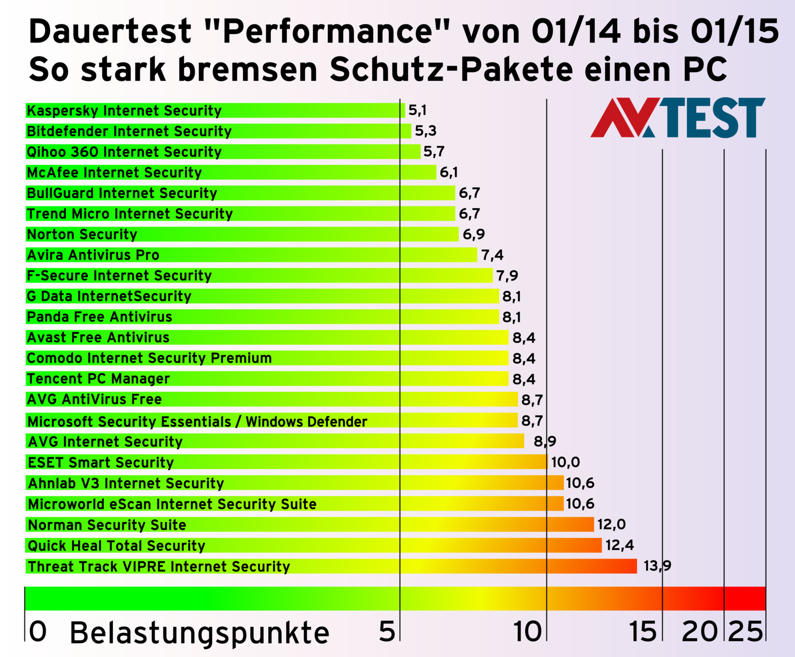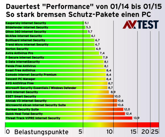 Die Lösungen von Norman, Quick Heal und Threat Track bremsen einen PC schon deutlich mit ihren 12, 12,4 und 13,9 Belastungspunkten. Den schlechtesten Wert mit 25 Bremspunkten hat kein Produkt erreicht.