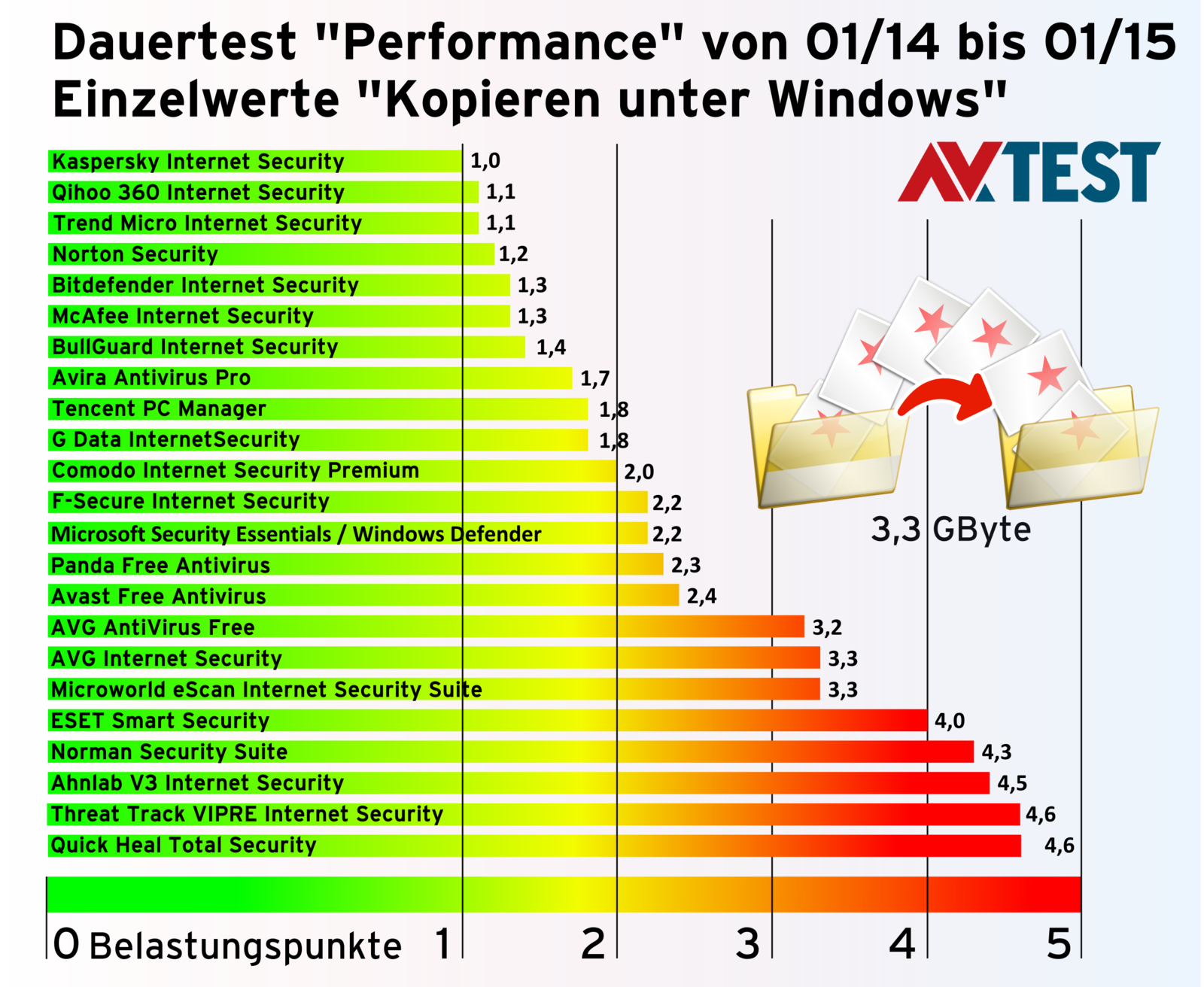 Der Test belegt, dass lediglich die Lösung von Qihoo 360 und Kaspersky den Kopiervorgang nur sehr gering verzögern. 8 Produkte müssen bereits zwischen 1 und 2 Punkte für ihre Belastung hinnehmen. 5 Schutzpakete liegen im Test zwischen 2 und 3 Punkten, 3 Pakete zwischen 3 und 4 Punkten und 5 Pakete sogar im Schnitt bei über 4 Punkten.