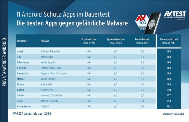 Der Dauertest mit 11 Security-Apps von Januar bis Juni 2024 zeigt viele gute Produkte für Android-Geräte. Die Schutz-Apps von Avast, AVG, Bitdefender, F-Secure, Kaspersky, McAfee und Norton stehen an der Tabellenspitze mit den maximal erreichbaren 18 Punkten. Allerdings folgen mir recht guten Werten von 17,8 bis 17,1 Punkten die restlichen geprüften Apps. Wahrlich keine schlechten Endwerte.