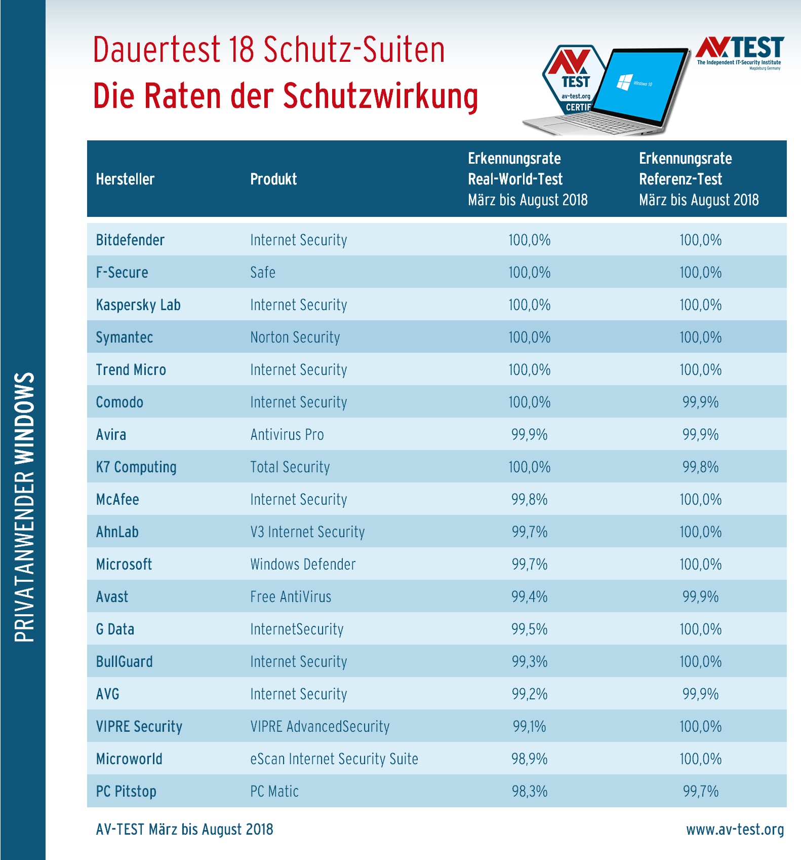 In der Untersuchung konnten die Produkte in jeder der drei geprüften Kategorien bis zu 6 Punkte erhalten. Die 18 Punkte erreichte im Dauertest von März bis August 2018 nur das Schutzpaket Avira Antivirus Pro. Mit allerdings sehr guten 17,8 bis 17,5 Punkten folgen die Pakete von Kaspersky Lab, McAfee, AhnLab, Bitdefender und Vipre Security. In einem klassischen Zertifizierungstest von AV-TEST würden sie deshalb neben einem Sicherheitszertifikat auch noch die Auszeichnung TOP-PRODUCT erhalten. Diese verleiht das Labor an alle Produkte mit einem Endergebnis von 18 bis 17,5 Punkten.