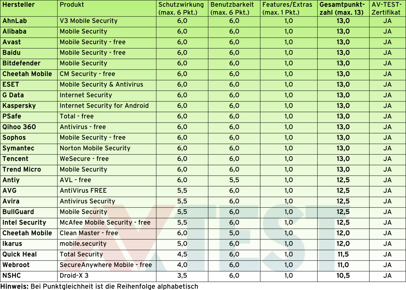 Das Ergebnis ist überragend: 24 von 25 Apps holten sich die maximalen 6 Punkte für ihre gute Leistung ab. Lediglich die App von Antiy bekam nur 5,5 Punkte, da sie eine gute App falsch einstufte und dann blockierte.