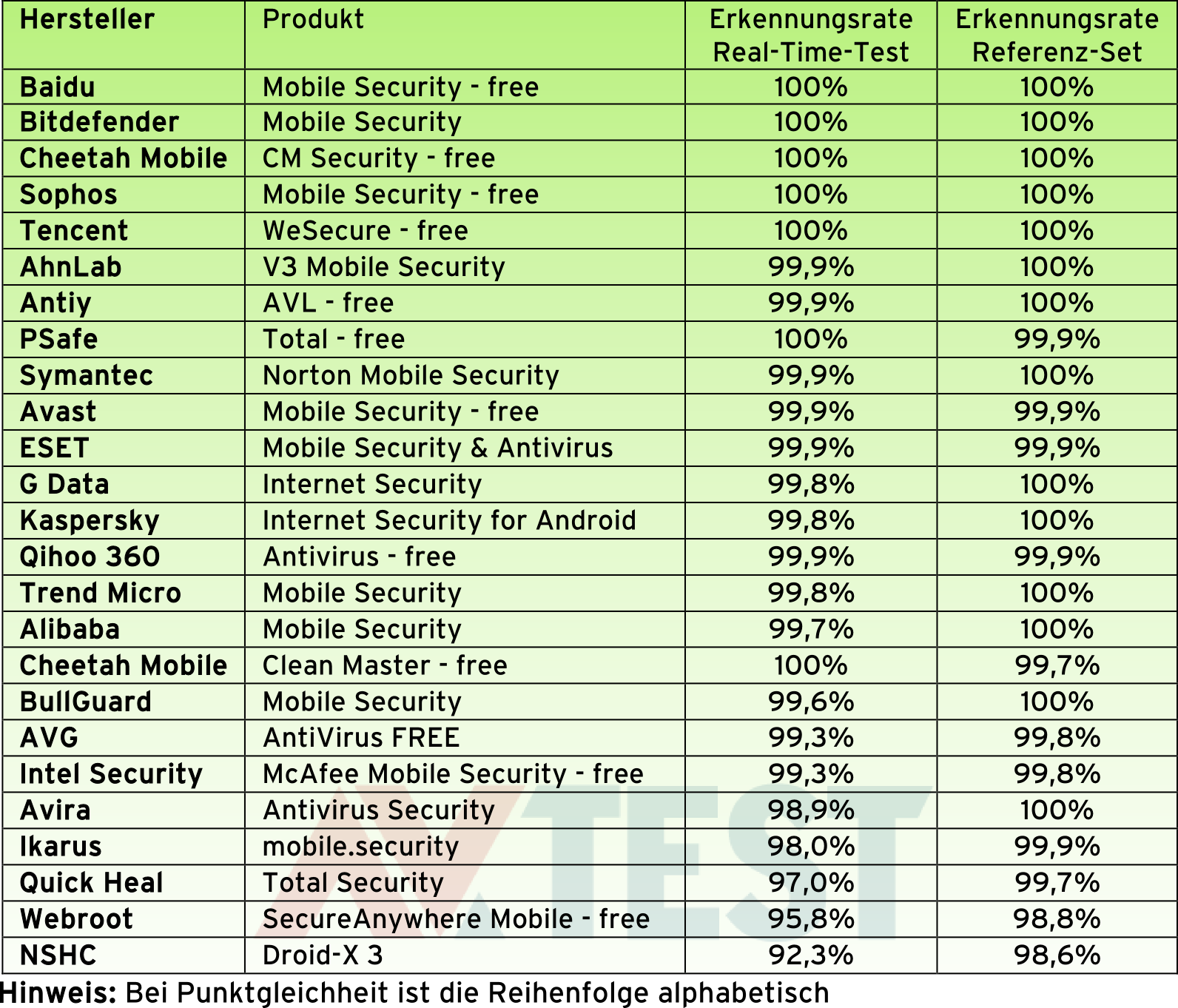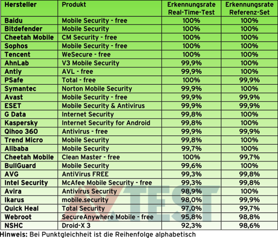 Trotz dieser schwierigen Tests erzielten 16 der 25 geprüften Apps den Bestwert von 6 Punkten. Absolut fehlerfrei mit je 100 Prozent Erkennung waren hier die Apps von Baidu, Bitdefender, Cheetah Mobile mit CM Security, Sophos und Tencent. Die weiteren 10 Apps lagen nur ganz knapp dahinter.
