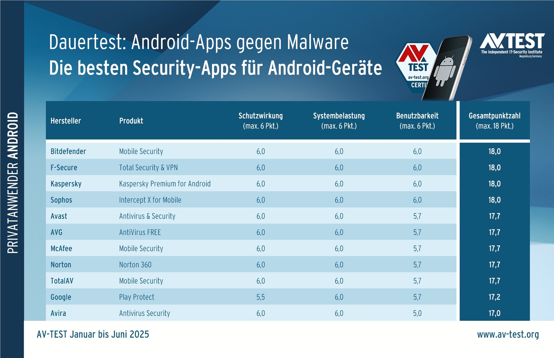 Mit einer guten Sicherheits-App lässt sich ein solcher Fall zwar nie ganz ausschließen, das Risiko wird jedoch deutlich verringert. Nutzer haben die freie Auswahl, wie dieser Test zeigt, denn die Security-Apps von Bitdefender, F-Secure, Kaspersky und Sophos schließen den Test mit Bestwerten ab. Weitere 5 Apps im Test folgen mit noch sehr guten 17,7 von 18 Punkten.