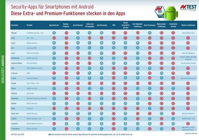 Alle zwei Monate prüft das Labor von AV-TEST bis zu 20 Android-Apps auf ihre Sicherheitsleistung. In den Tests liegt das Augenmerk auf der Sicherheit, der Benutzbarkeit und der Geschwindigkeit der Apps. Alles, was die Tools an weiteren Extras oder Sonderfunktionen mitbringen, wird vom Labor nicht berücksichtigt. Denn die Apps haben sehr unterschiedliche Extras an Bord – andere wiederum fast keine. Daher findet auch kein Vergleich statt. Dennoch hat sich das Labor – ohne weitere Prüfung oder Wertung – die zusätzlichen Funktionen der Apps angeschaut. Hier eine Übersicht, was noch alles in den Apps steckt.
