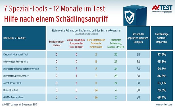 Als die besten Partner im Notfall empfehlen sich bei den 9 geprüften Suiten die Produkte von Bitdefender und Kaspersky. Sie liegen mit 98,2 Prozent gereinigter und reparierter Systeme gleich auf. Aber auch weitere Schutzpakete entfernten die Schädlinge und weitere gefährliche Teile von den Systemen. Sie hinterließen nur in 8 bis 15 Fällen ungefährliche Dateireste: G Data, Avast, Symantec und Avira. Die Suite von Avast lässt sich sogar kostenlos nutzen. Die Suiten von Malwarebytes, Microsoft und Enigma arbeiten nicht verlässlich genug.