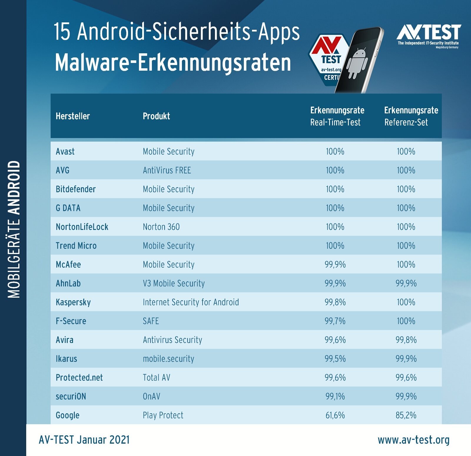Ist ein Smartphone allerdings mit einer guten Security-App geschützt, brauchen Nutzer kaum Angst zu haben, dass man ihr Gerät in einem Bot-Netzwerk versklavt. Nur auf den unter Android automatisch verfügbaren Schutz durch Google Play Protect sollte man sich aber nicht verlassen. Das zeigt der Test deutlich, denn dort wurde die Schutzleistung von Play Protect zum Vergleich mitgeprüft. Das Labor von AV-TEST hat 15 Schutz-Apps für Android auf ihre Schutzwirkung, Systembelastung und die Benutzbarkeit – wie etwa Fehlalarme – untersucht. Mit im Test sind die Android-Schutz-Apps von AhnLab, Avast, AVG, Avira, Bitdefender, F-Secure, G DATA, Google, Ikarus, Kaspersky, McAfee, NortonLifeLock, Protected.net (Total AV), securiON und Trend Micro.