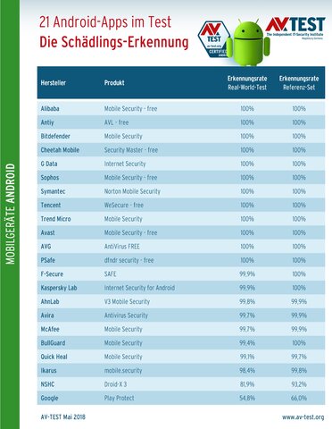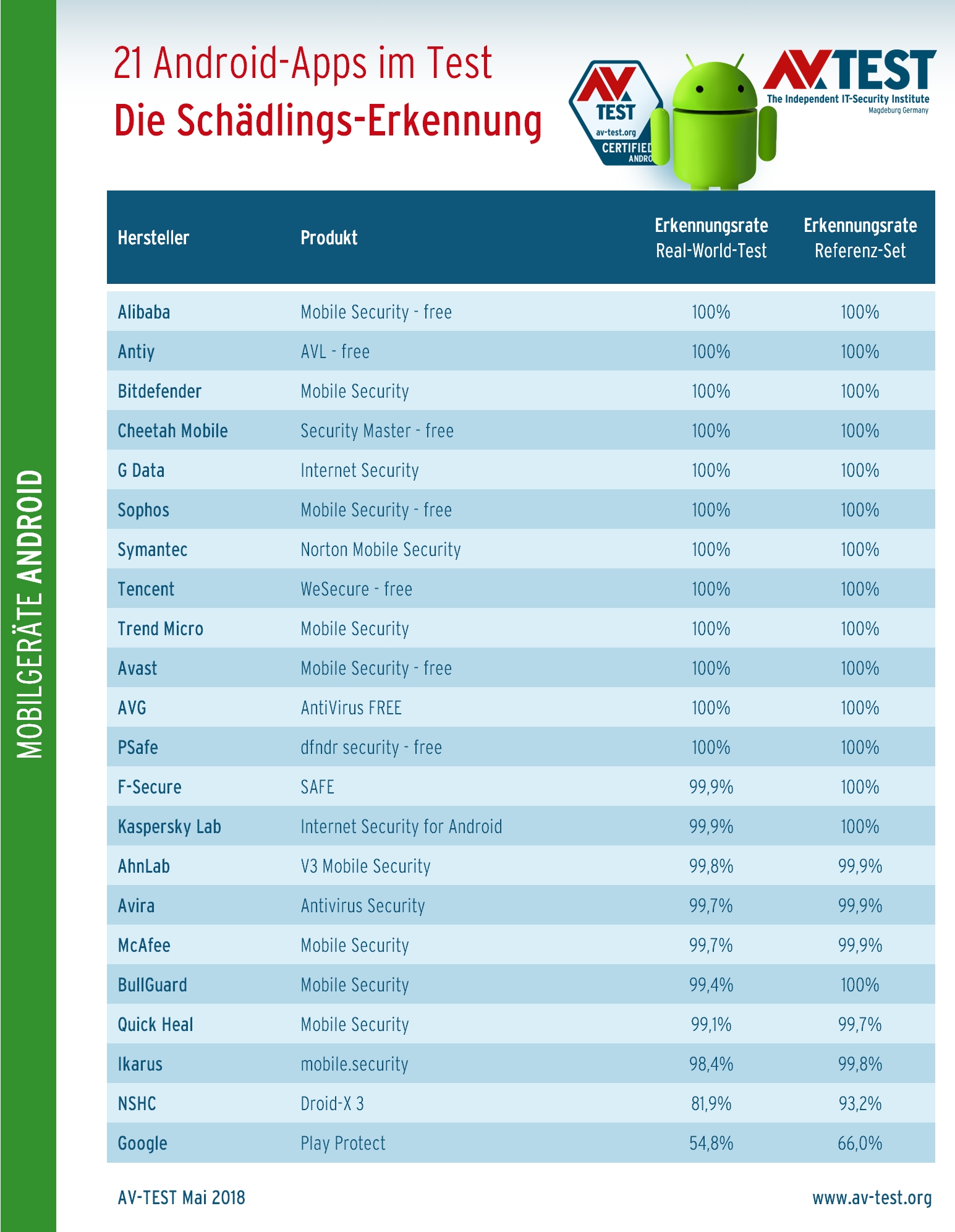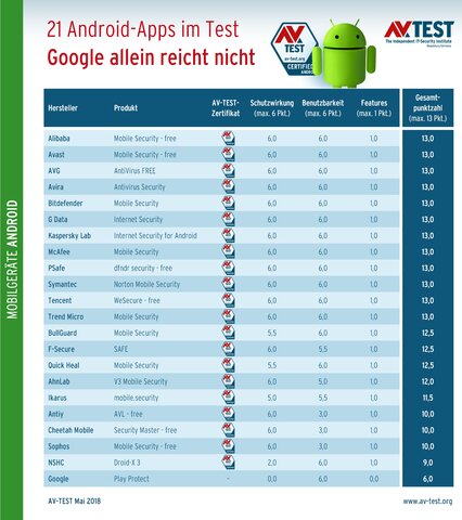Das Labor untersuchte im Mai 2018 unter der Plattform Android 6.0.1 insgesamt 21 Sicherheits-Apps und Google Play Protect. In den getesteten Abschnitten Schutzwirkung und Benutzbarkeit vergab das Labor jeweils maximal 6 Punkte, für Features höchstens 1 Punkt. Den Bestwert von 13 Punkten erzielen gleich 12 Apps: Alibaba, Avast, AVG, Avira, Bitdefender, G Data, Kaspersky Lab, McAfee, PSafe, Symantec, Tencent und Trend Micro. Weitere 3 Apps erhalten noch sehr gute 12,5 Punkte: BullGuard, F-Secure und Quick Heal. Die restlichen Apps liegen zwischen 12 und 9 Punkten. Am Ende der Liste findet sich das mitgeprüfte Google Play Protect mit nur 6 Punkten.