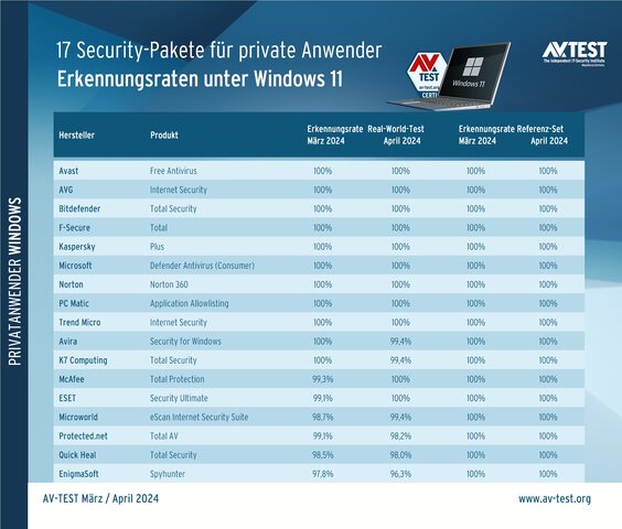 Am aktuellen Test, der im März und im April 2024 unter Windows 11 als Testplattform ausgeführt wurde, haben folgende 17 Hersteller teilgenommen: Avast, AVG, Avira, Bitdefender, EnigmaSoft, ESET, F-Secure, K7 Computing, Kaspersky, McAfee, Microsoft, Microworld, Norton, PC Matic, Protected.net, Quick Heal und Trend Micro. Im Test werden immer die aktuellsten, öffentlich verfügbaren Versionen der Produkte für den Test verwendet. Diese können sich jederzeit per Online-Update aktualisieren und ihre „In-the-Cloud“-Services nutzen.
