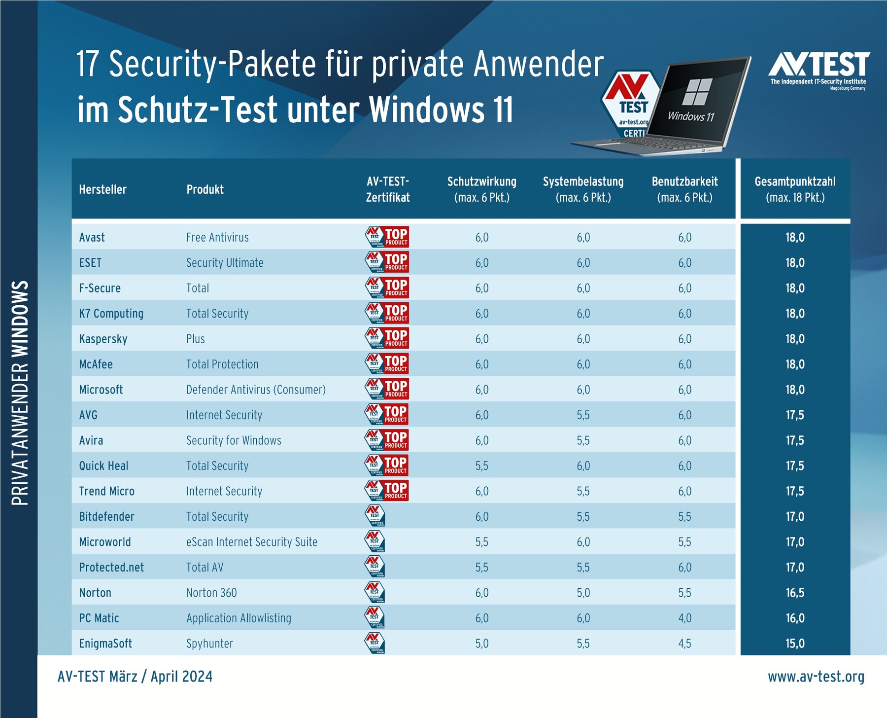 Das Endergebnis ist etwas durchmischter als in anderen Tests. Viele Schutzprogramme für Windows hatten kleine Fehltritte, einige wenige etwas größere. Das sollte aber nicht von der Tatsache ablenken, dass 7 der 17 untersuchten Security-Pakete den März- und April-Test 2024 mit dem Bestwert von 18 Punkten beenden: Sie kommen von Avast, ESET, F-Secure, K7 Computing, Kaspersky, McAfee und Microsoft. Mit sehr guten 17,5 Punkten liegen ganz knapp dahinter die Systembeschützer für Windows 11 von AVG, Avira, Quick Heal und Trend Micro. Alle 11 genannten Pakete erhalten somit die zusätzliche Auszeichnung TOP PRODUCT.