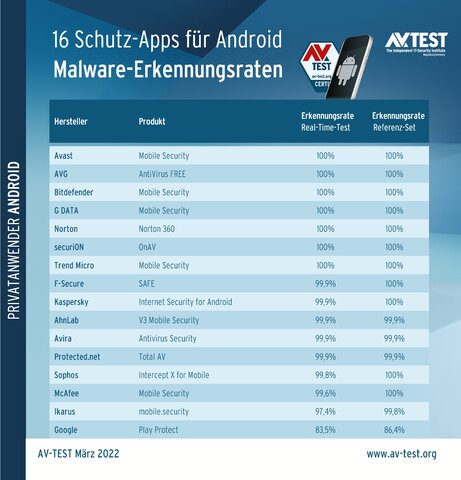 Die Anzahl an mobilen Bedrohungen für Android wächst täglich. Da die Standard-Schutzmaßnahmen von Google nicht ausreichen, sollte auf jedem privaten oder geschäftlichen Android-Smartphone eine gute Schutz-App ihren Dienst verrichten. AV-TEST hat im Labor 19 Schutzprogramme für mobile Android-Geräte untersucht und bewertet. Bei vielen Apps ist das Ergebnis top, aber gerade beim Google-Standardschutz eher mäßig.