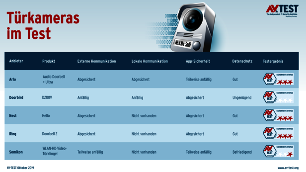 Mit der Arlo Audio Doorbell in Kombination mit dem Kamerapaket „Ultra“, der Hello von Nest und der Doorbell 2 von Ring erarbeiten sich drei von fünf überprüften Videoklingeln die Bestnote im Sicherheitsschnelltest des AV-TEST Instituts. Die aktuelle Berichterstattung über Unzulänglichkeiten im Datenschutz bei der Ring-Mutter Amazon wird hier der Vollständigkeit halber erwähnt, ist jedoch nicht Bestandteil oder Kriterium dieses Testverfahrens. Die WLAN-HD-Video-Türklingel von Somikon schneidet aufgrund von Sicherheitsmängeln im Testpunkt externe Kommunikation sowie von Schwächen bei der Prüfung hinsichtlich App und Datenschutz mit lediglich einem von drei Sternen ab und kann somit nicht empfohlen werden. Noch schlechter schlägt sich die D2101V von Hersteller DoorBird, die grobe Sicherheitsmängel in fast allen überprüften Testkategorien aufweist und dementsprechend keinen der drei möglichen Sterne erhält.