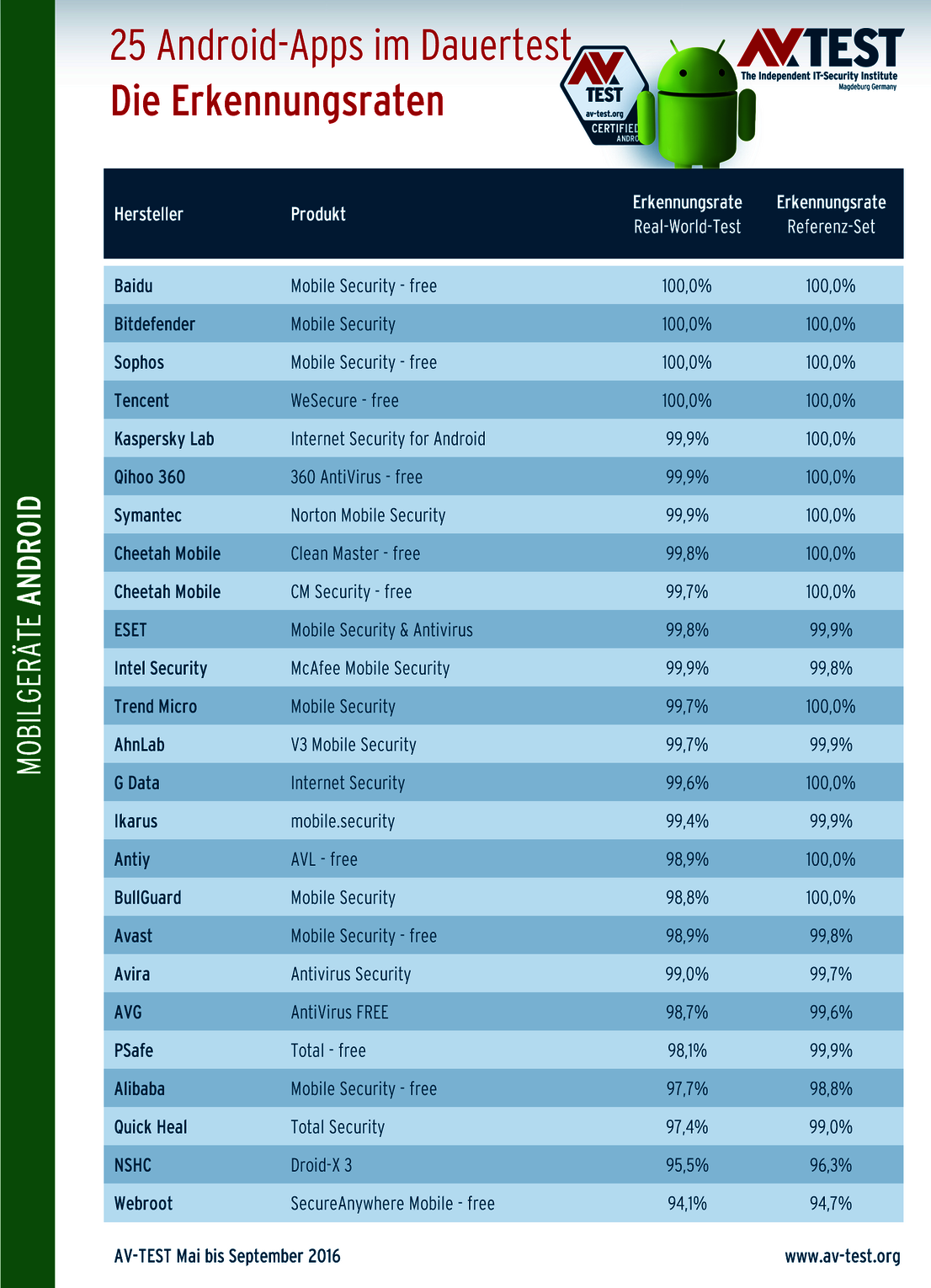 Diesen schwersten Abschnitt mit insgesamt 3 getrennten Testrunden schafften absolut fehlerfrei die Apps von Baidu, Bitdefender, Kaspersky Lab, Qihoo 360, Sophos, Symantec und Tencent.