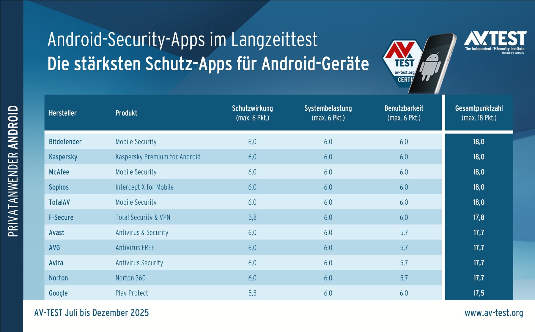 Auf allen Android-Geräten mit einer lizenzierten Google-Version läuft zwar der Google-interne Schutz Play Protect, aber dieser schützt die Geräte nicht immer. Das zeigt auch der Test für das 2. Halbjahr 2025 von Juli bis Dezember 2025 unter Android 12 (Codename Snow Cone). Der Google-Schutz arbeitet zwar gut, aber nicht fehlerfrei und landet so am Ende der Testtabelle. Die anderen 10 geprüften Schutz-Apps erledigen ihren Job im Test besser und zum Teil sogar völlig fehlerfrei.