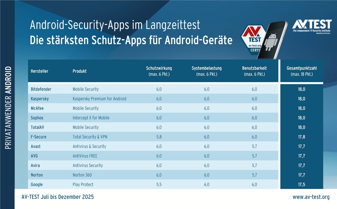 Nach Schätzungen von Experten und Google sind weltweit bis zu 4 Milliarden Android-Geräte aktiv, auf denen sich eine Schutz-App aufspielen lässt. Das ist auch notwendig, denn selbst nicht gerootete Geräte sind zunehmend Hackerangriffen mit verseuchten Apps ausgesetzt. Diese enthalten oft versteckte Exploits für Schwachstellen mit und versuchen, die Geräte zu übernehmen. Gute Schutz-Apps für Android verhindern das, indem sie gefährliche Apps erkennen oder verdächtige Aktionen blockieren. Welche Security-Apps über 6 Monate hinweg am besten schützen, haben die Experten von AV-TEST im Android-Halbjahrestest von Juli bis Dezember 2025 herausgefunden. Dabei zeigen 10 Security-Apps sowie der integrierte Google Schutz Play Protect, wie effektiv sie mehrere tausend Angriffe abwehren – oder wo Angreifer leichter durchschlüpfen.