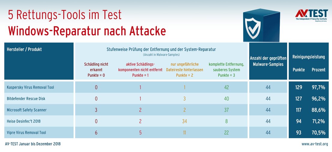Beim Test mit den 5 Spezial-Tools ist die Bilanz ähnlich leicht durchwachsen wie bei den Security-Suiten. Das Kaspersky Removal Tool und die Bitdefender Rescue Disk erkannten in allen 44 Testfällen die Malware. Allerdings konnten beide Tools in jeweils einem Fall die gefährlichen Komponenten nicht komplett löschen. Die beste Gesamtbilanz mit 97,7 Prozent Reinigungsleistung hat das Tool von Kaspersky mit 42 komplett sauberen Systemen und 1 System mit ungefährlichen Dateiresten. Gleich danach folgt das Tool von Bitdefender mit einer Quote von 96,2 Prozent: 40 saubere Systeme und 3-mal lästige Dateireste.