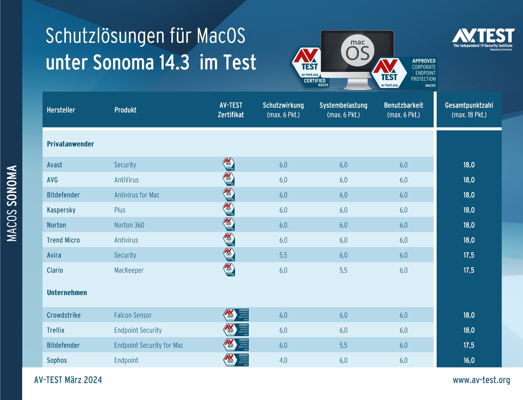 Die Laborexperten von AV-TEST untersuchten in ihrem Quartalstest Q1 von Januar bis März 2024 8 Produkte für Privatanwender und 4 Endpoint-Lösungen für Unternehmen. Zum ersten Mal kam dabei die neue Version MacOS Sonoma 14.3 als Testplattform zum Einsatz. Alle Produkte wurden in den Testbereichen Schutzwirkung, Systembelastung und Benutzbarkeit geprüft. Für jeden Bereich vergeben die Tester bis zu 6 Punkte. Der Bestwert im Test liegt somit bei 18 Punkten.