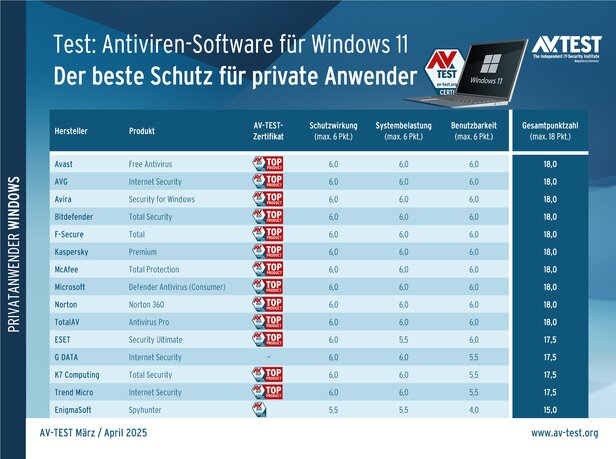 Wie gut am Markt verfügbare Schutzpakete die Systeme gegen alle möglichen Exemplare von Malware wappnen, hat das Labor von AV-TEST untersucht. Im aktuellen zweimonatigen Test von März bis April 2025 prüften die Experten 15 Security-Pakete auf ihre Schutzwirkung, Systembelastung und Benutzbarkeit. Jedes Produkt kann in jedem Bereich bis zu 6 Wertungspunkte ergattern und somit bis zu 18 Punkte erreichen. Alle Produkte mit 18 oder 17,5 Punkten erhalten dann nicht nur das Zertifikat „Certified“ für geprüfte Sicherheit, sondern auch noch zusätzlich die Auszeichnung TOP PRODUCT.