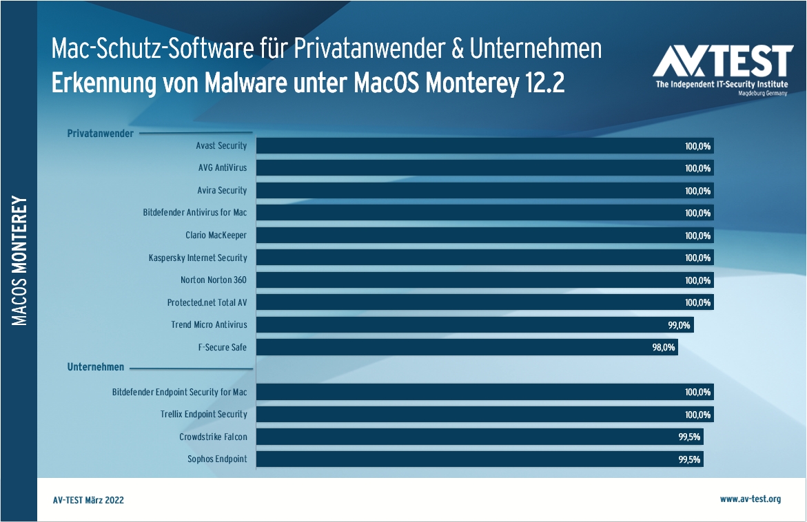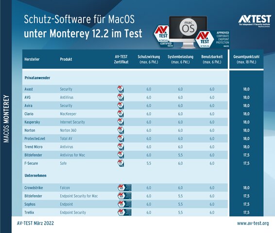 Der Markt bietet viele Produkte an, um private Macs oder Arbeitsgeräte im Unternehmen zu schützen. AV-TEST hat im aktuellen Test 10 Produkte für Endanwender und 4 Lösungen für Unternehmen im Labor untersucht. Der Test wurde im März 2022 unter der MacOS-Version Monterey 12.2 ausgeführt. Mit im Test sind 10 Pakete für Privatnutzer von Avast, AVG, Avira, Bitdefender, Clario, F-Secure, Kaspersky, Norton, Protected.net und Trend Micro. Weiterhin wurden 4 Unternehmenslösungen von Bitdefender, Crowdstrike, Sophos und Trellix untersucht.