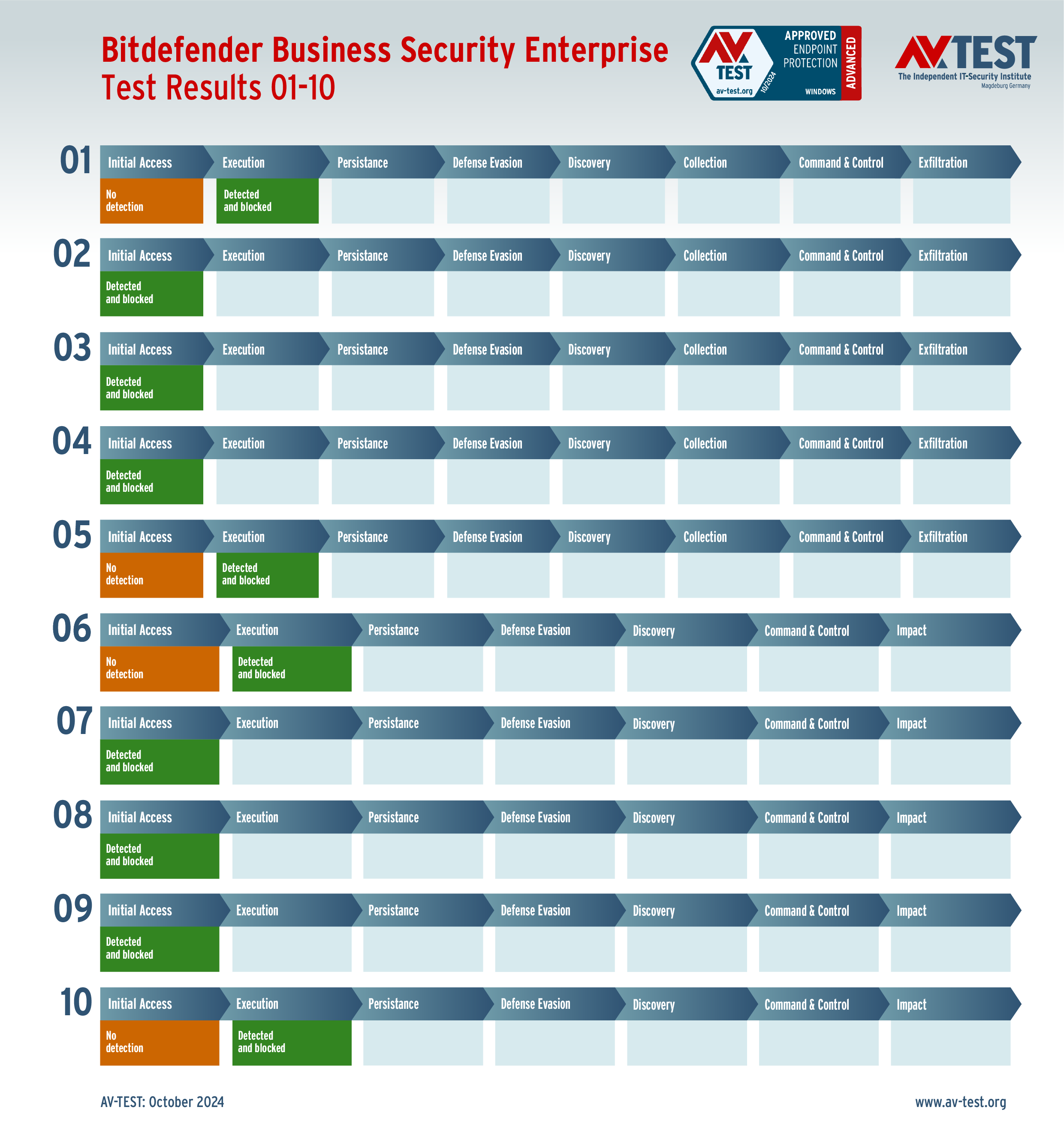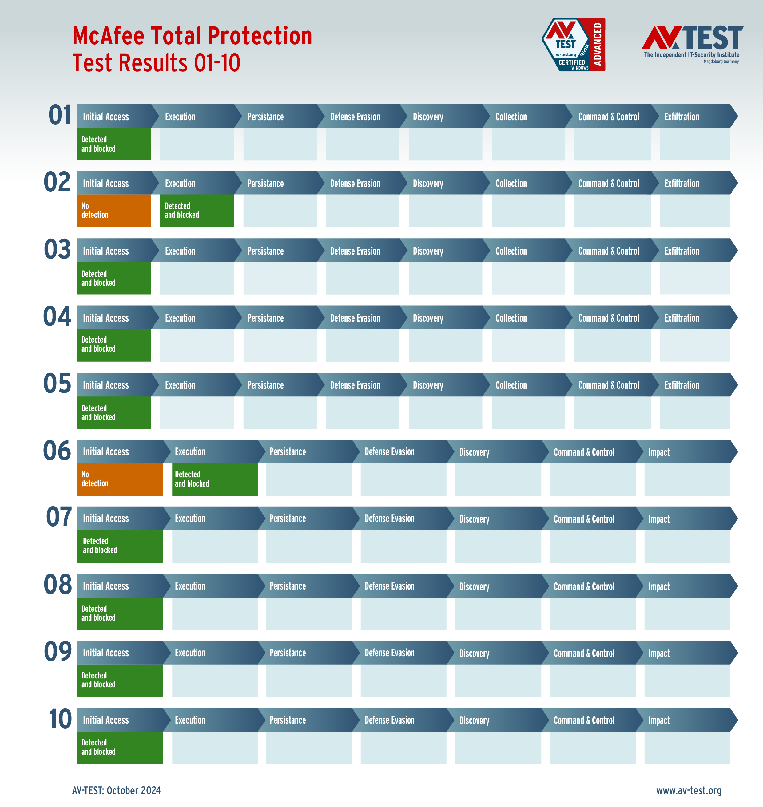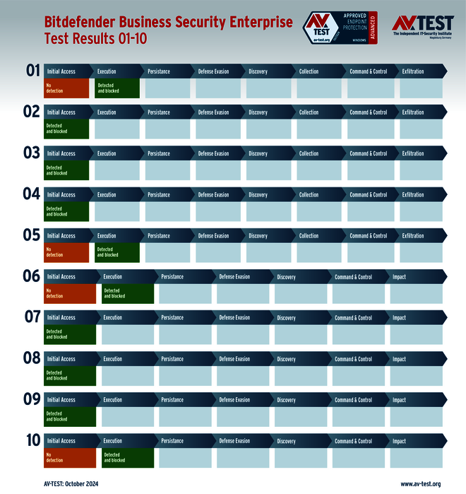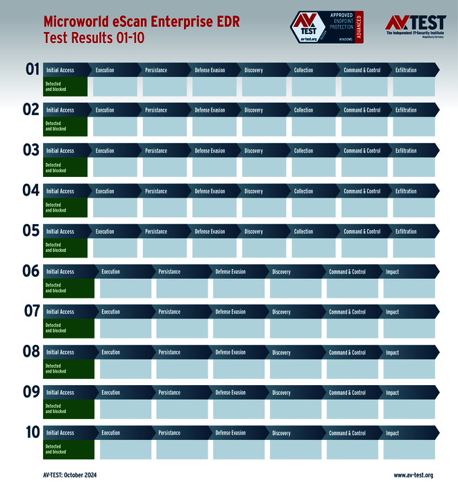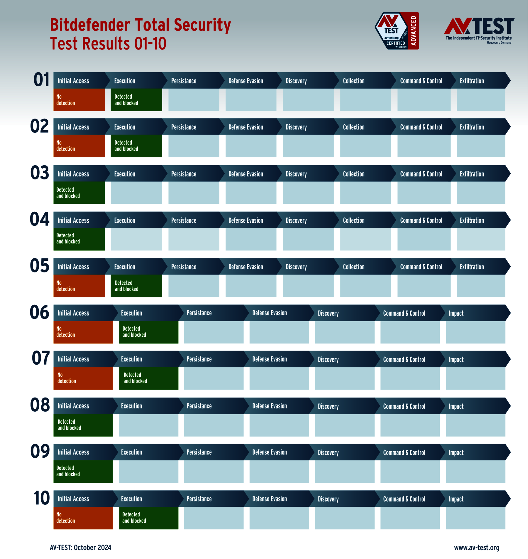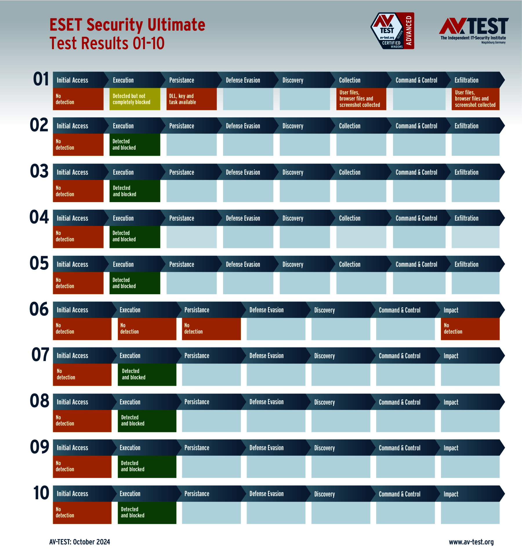 Die 10 realistischen Attacken auf die Windows-11-Test-PCs wurden mit jeweils einer installierten Schutzlösung ausgeführt. Jedes Angriffsszenario ist in einer Matrix nach dem MITRE ATT&CK-Standard beschrieben. Dort sind alle einzelnen Schritte des Angriffs definiert und auch die Abwehraktionen dokumentiert. So kann eine Malware bereits direkt erkannt oder auch erst in späteren Aktionen gestoppt werden. Im Test greifen 5-mal Ransomware und 5-mal Infostealer an. Bei Ransomware gilt es drei wesentliche Schritte zu erkennen – bei Infostealern sind es vier Aktionen. Für jede abgewehrte Aktion vergibt das Labor einen halben oder ganzen Punkt. Ein Schutzprodukt kann für eine abgewehrte Ransomware fünfmal 3 Punkte erhalten, für die Infostealer sind es fünfmal 4 Punkte. Somit liegt der Bestwert im Schutz-Score am Ende pro Produkt bei 35 Punkten.