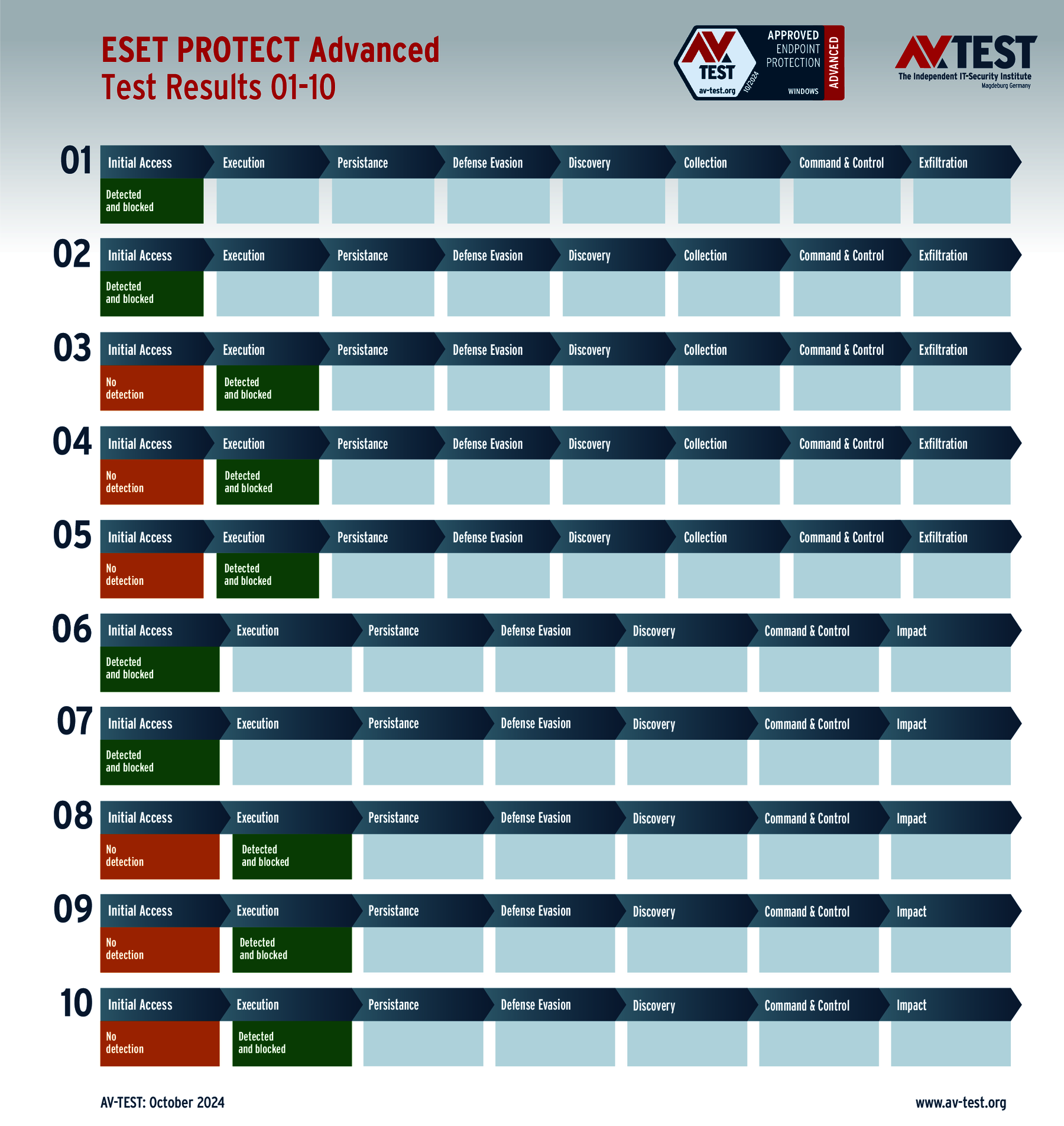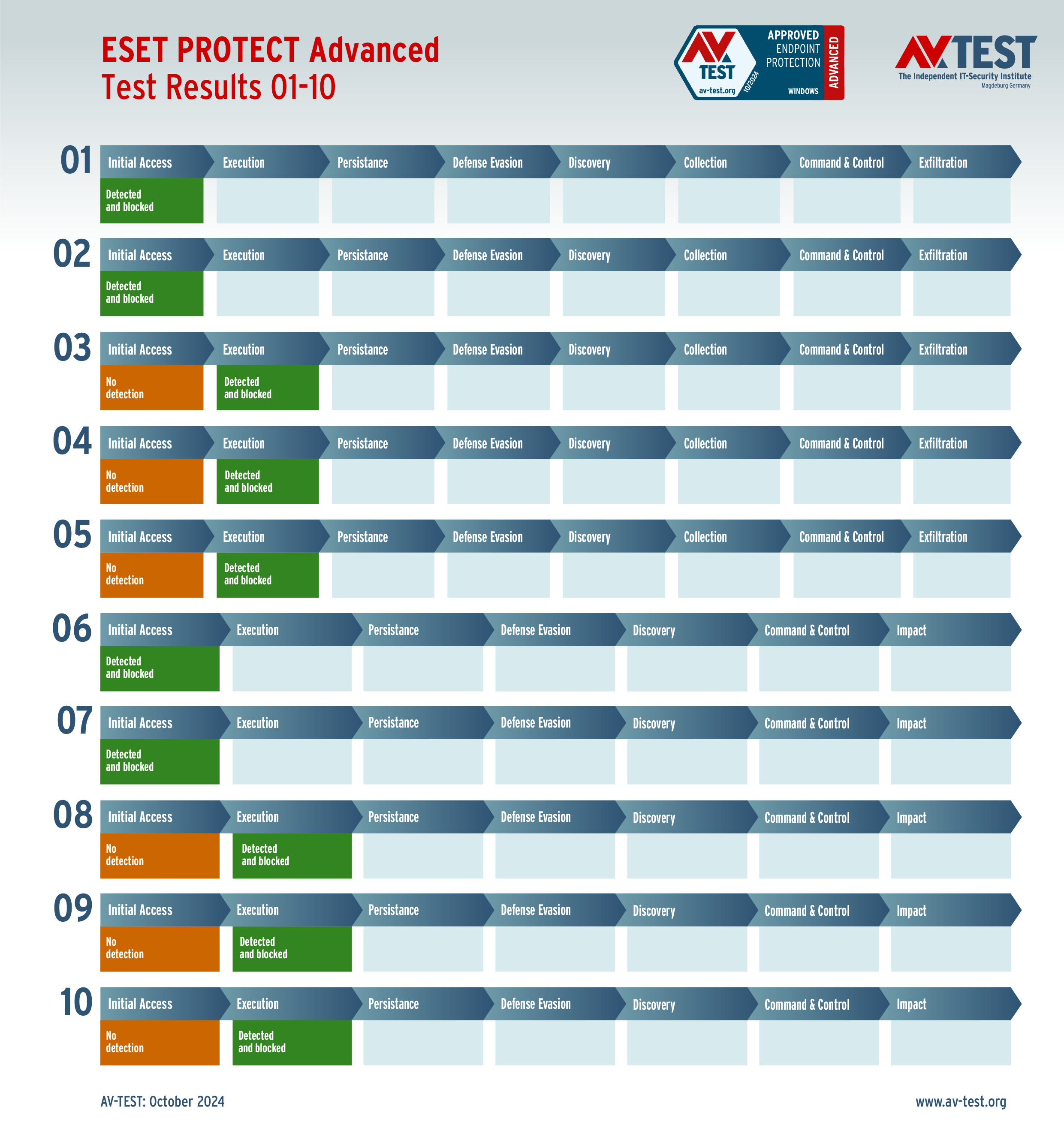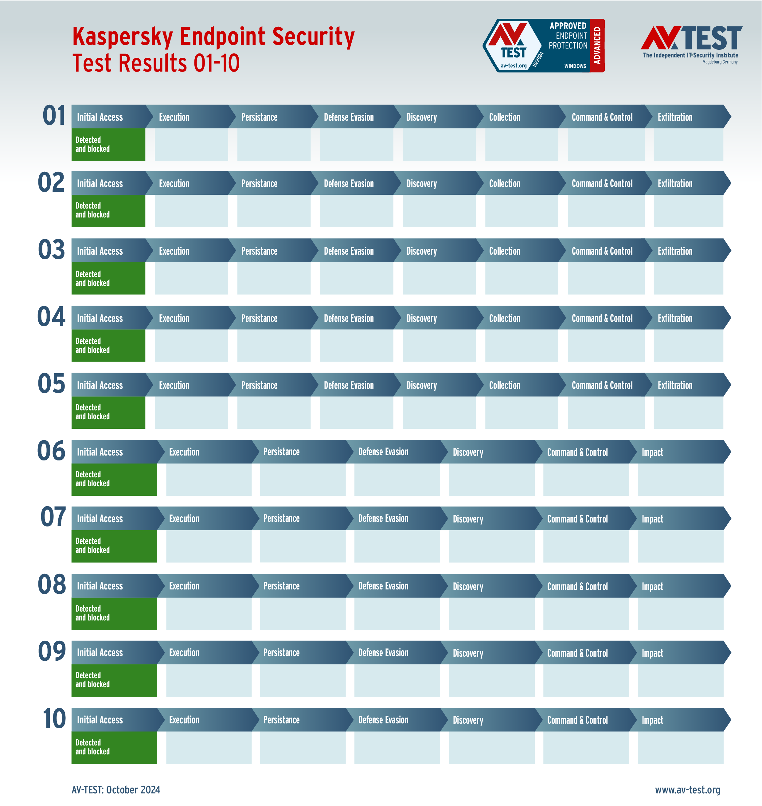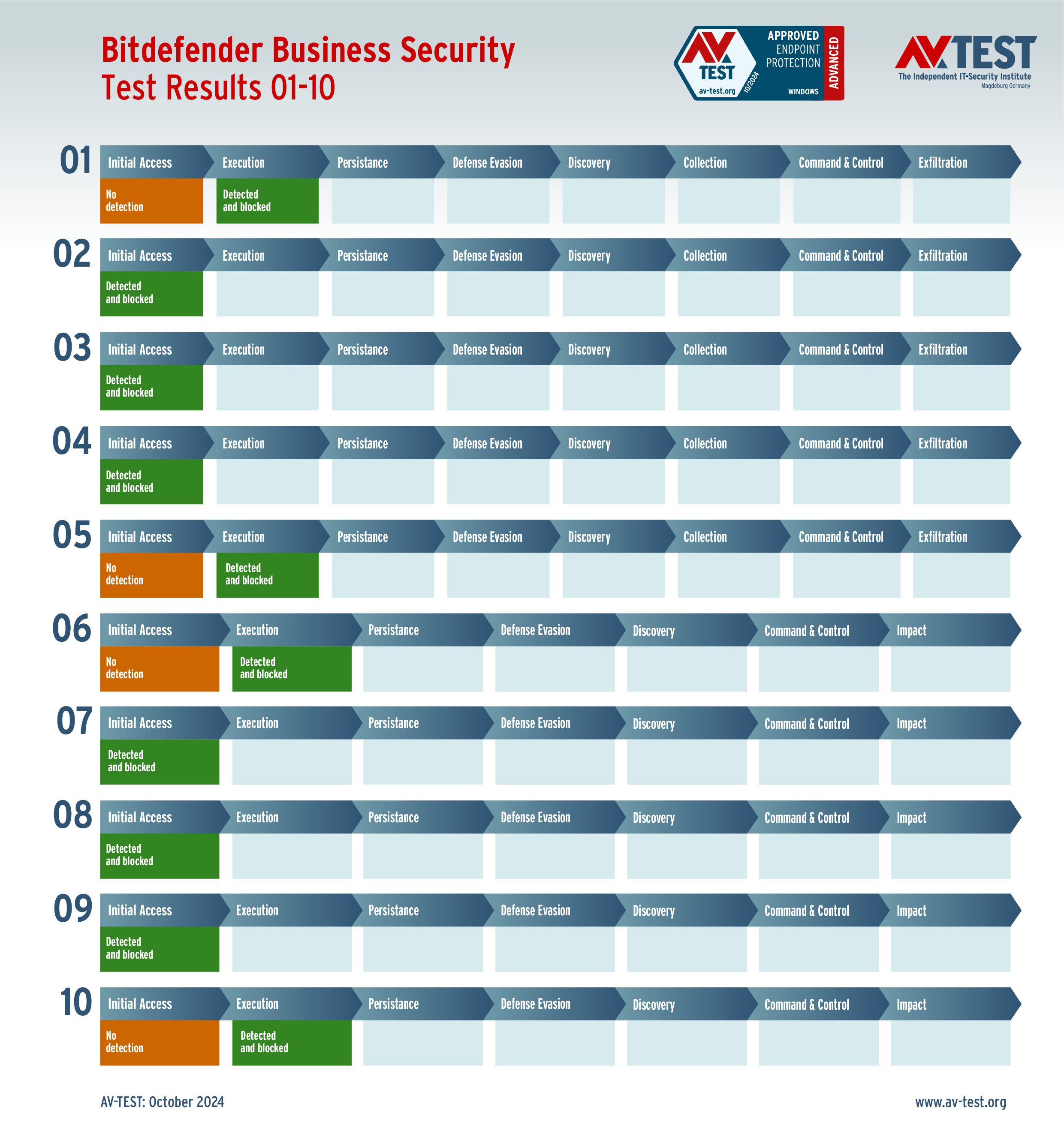 Die 10 realistischen Attacken auf die Windows-11-Test-PCs wurden mit jeweils einer installierten Schutzlösung ausgeführt. Jedes Angriffsszenario ist in einer Matrix nach dem MITRE ATT&CK-Standard beschrieben. Dort sind alle einzelnen Schritte des Angriffs definiert und auch die Abwehraktionen dokumentiert. So kann eine Malware bereits direkt erkannt oder auch erst in späteren Aktionen gestoppt werden. Im Test greifen 5-mal Ransomware und 5-mal Infostealer an. Bei Ransomware gilt es drei wesentliche Schritte zu erkennen – bei Infostealern sind es vier Aktionen. Für jede abgewehrte Aktion vergibt das Labor einen halben oder ganzen Punkt. Ein Schutzprodukt kann für eine abgewehrte Ransomware fünfmal 3 Punkte erhalten, für die Infostealer sind es fünfmal 4 Punkte. Somit liegt der Bestwert im Schutz-Score am Ende pro Produkt bei 35 Punkten.