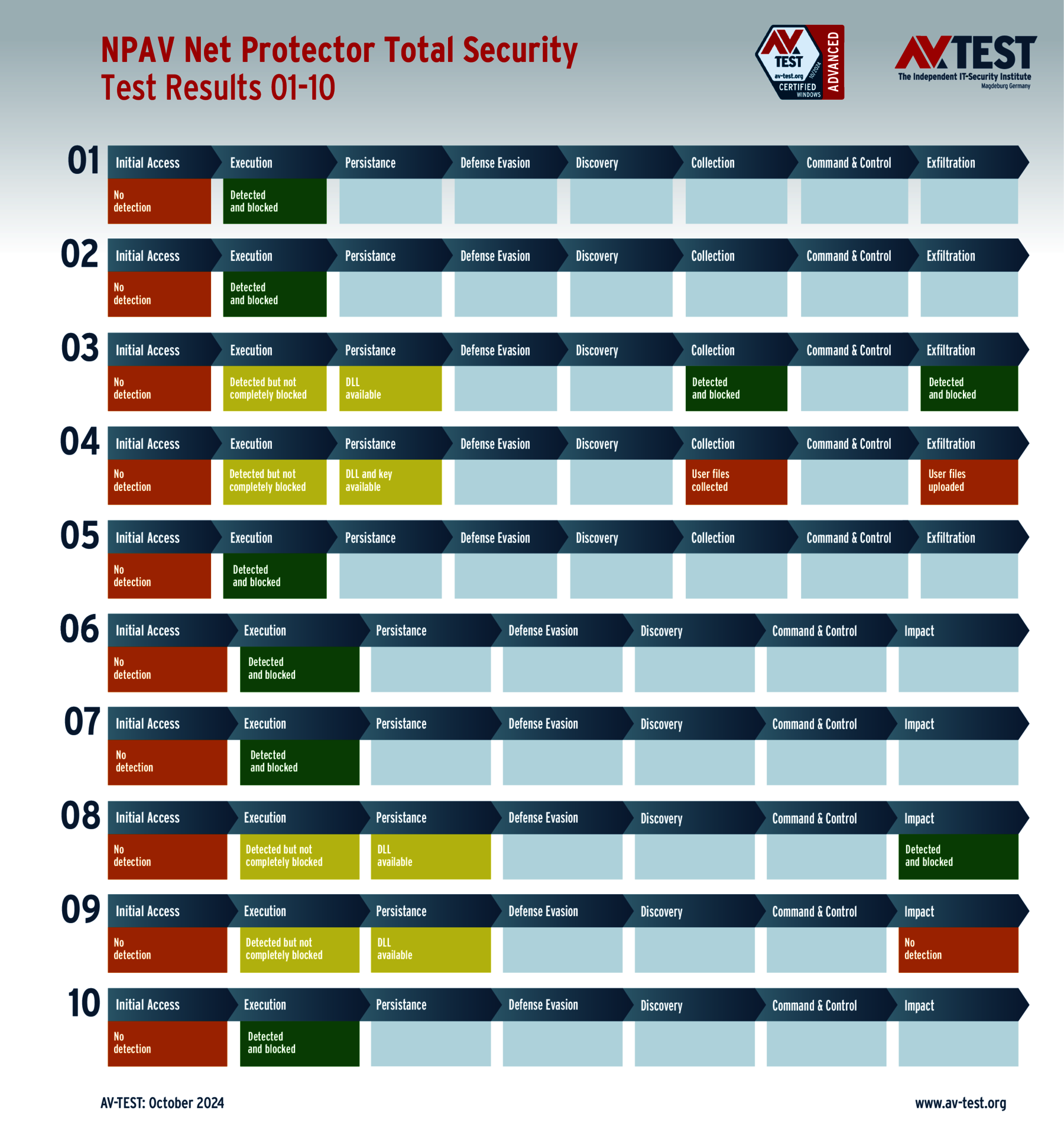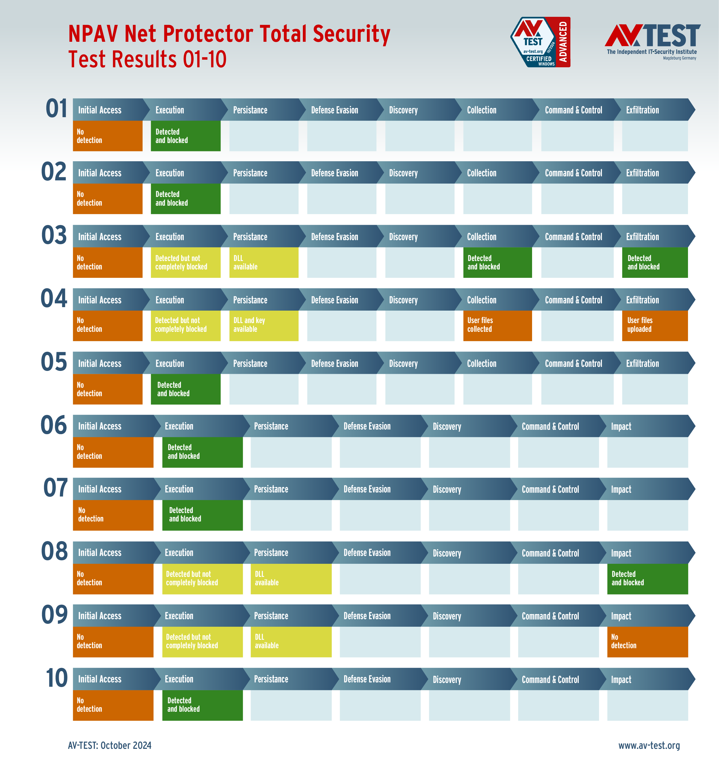 Das Paket von NPAV hat in 4 Szenarien seine Probleme. In 2 Fällen mit Ransomware wird diese zwar erkannt, aber nicht aufgehalten. Auch in weiteren Schritten agiert die Ransomware ungehindert. Nur in einem Fall gelingt es dem Schutzprodukt, die endgültige Verschlüsselung aufzuhalten; einmal nicht. Somit bleiben von 6 (2 -mal 3) möglichen Punkten nur 3 übrig.