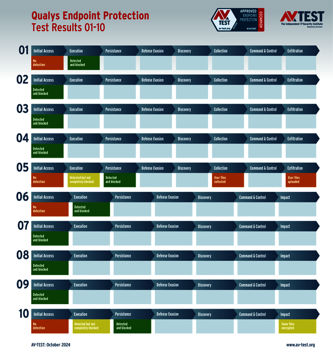 Lediglich Qualys hat Probleme mit der Malware. So erkennt der Unternehmensschutz zwar alle Angreifer, aber eine Ransomware und ein Infostealer können ungehindert agieren. Der Infostealer wird zwar mit weiteren Werkzeugen noch einmal teilweise abgefangen – er geht aber am Ende mit gestohlenen Daten als Sieger von Feld. Das kostet 2,5 von 4 Punkten als Abzug. Der Fall der Ransomware verläuft ähnlich. Dort wird auch ein weiterer Schritt fast gestoppt. Am Ende sind aber einzelne Daten verschlüsselt. Somit verliert Qualys einen weiteren Punkt. Am Ende stehen 31,5 von 35 Punkten im Schutz-Score.