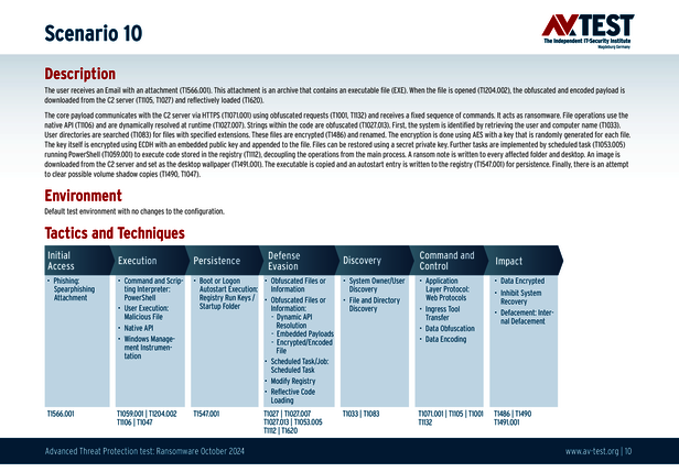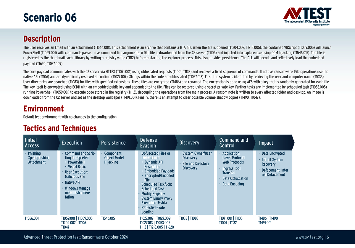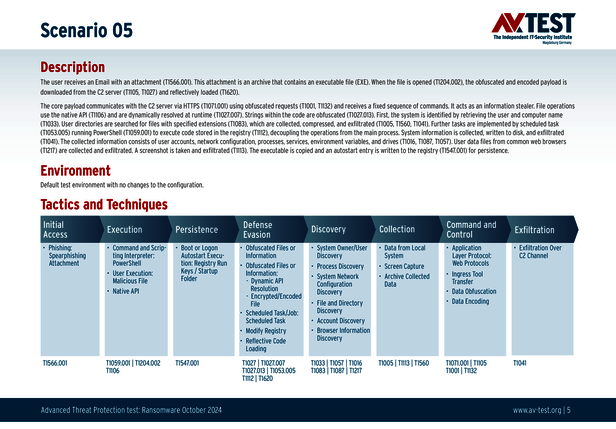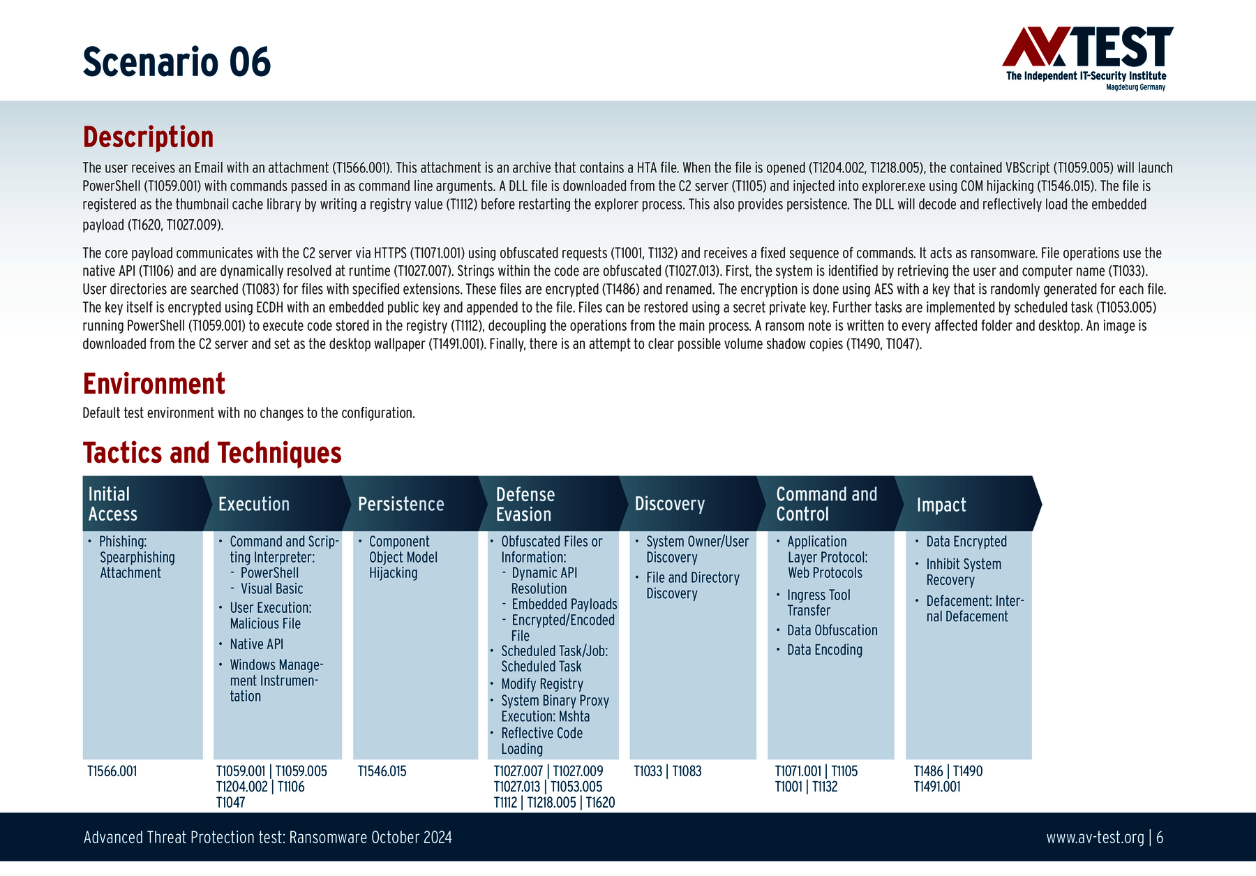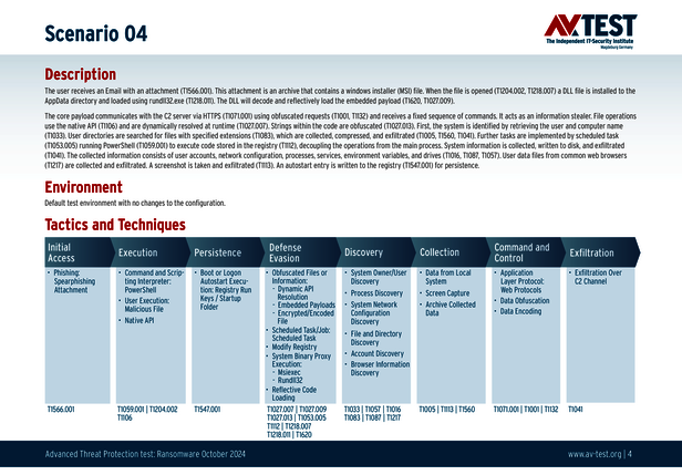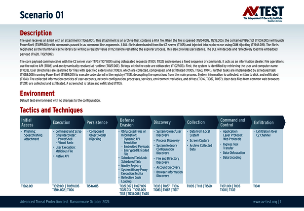 Alle Angriffsszenarien sind dokumentiert nach dem Standard der MITRE ATT&CK-Datenbank. Die einzelnen Unterpunkte, z.B. „T1566.001,“ stehen in der MITRE-Datenbank für „Techniques“ unter „Phishing: Spearphishing Attachment“. Jeder Testschritt ist so unter Fachleuten definiert und lässt sich nachvollziehen. Zusätzlich sind alle Angriffstechniken erklärt und wie dabei die Malware zum Zuge kommt.