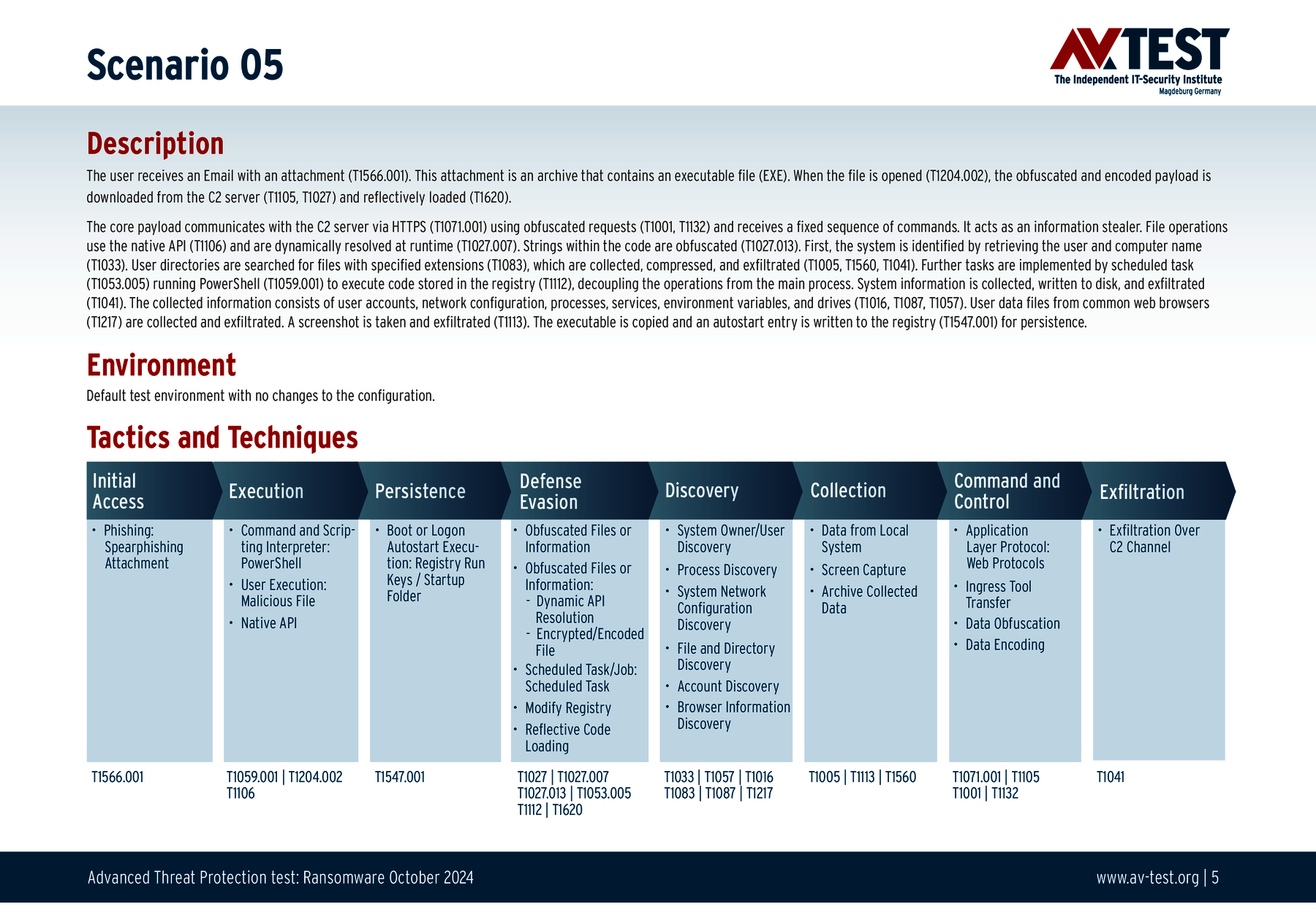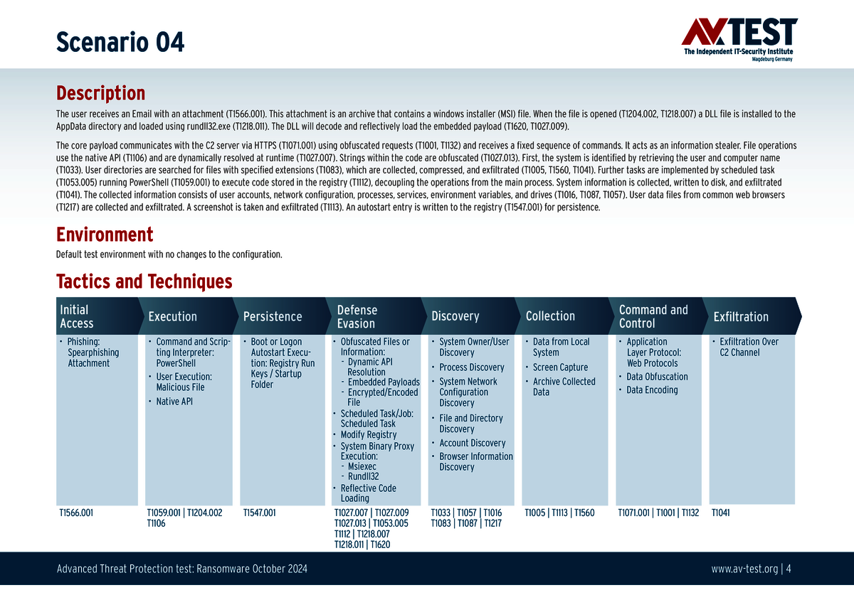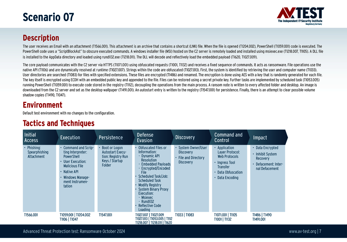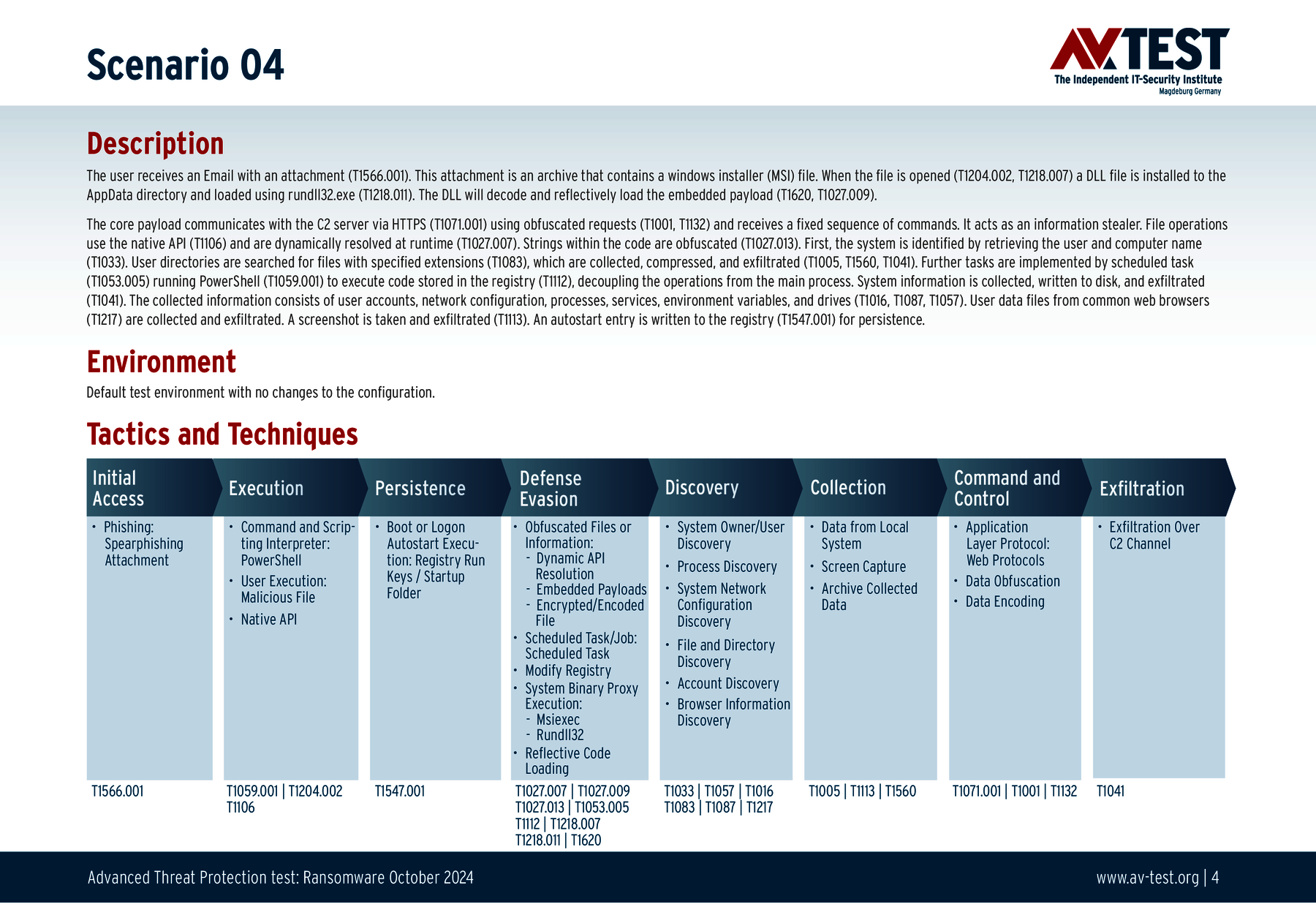 Alle Angriffsszenarien sind dokumentiert nach dem Standard der MITRE ATT&CK-Datenbank. Die einzelnen Unterpunkte, z.B. „T1566.001,“ stehen in der MITRE-Datenbank für „Techniques“ unter „Phishing: Spearphishing Attachment“. Jeder Testschritt ist so unter Fachleuten definiert und lässt sich nachvollziehen. Zusätzlich sind alle Angriffstechniken erklärt und wie dabei die Malware zum Zuge kommt.