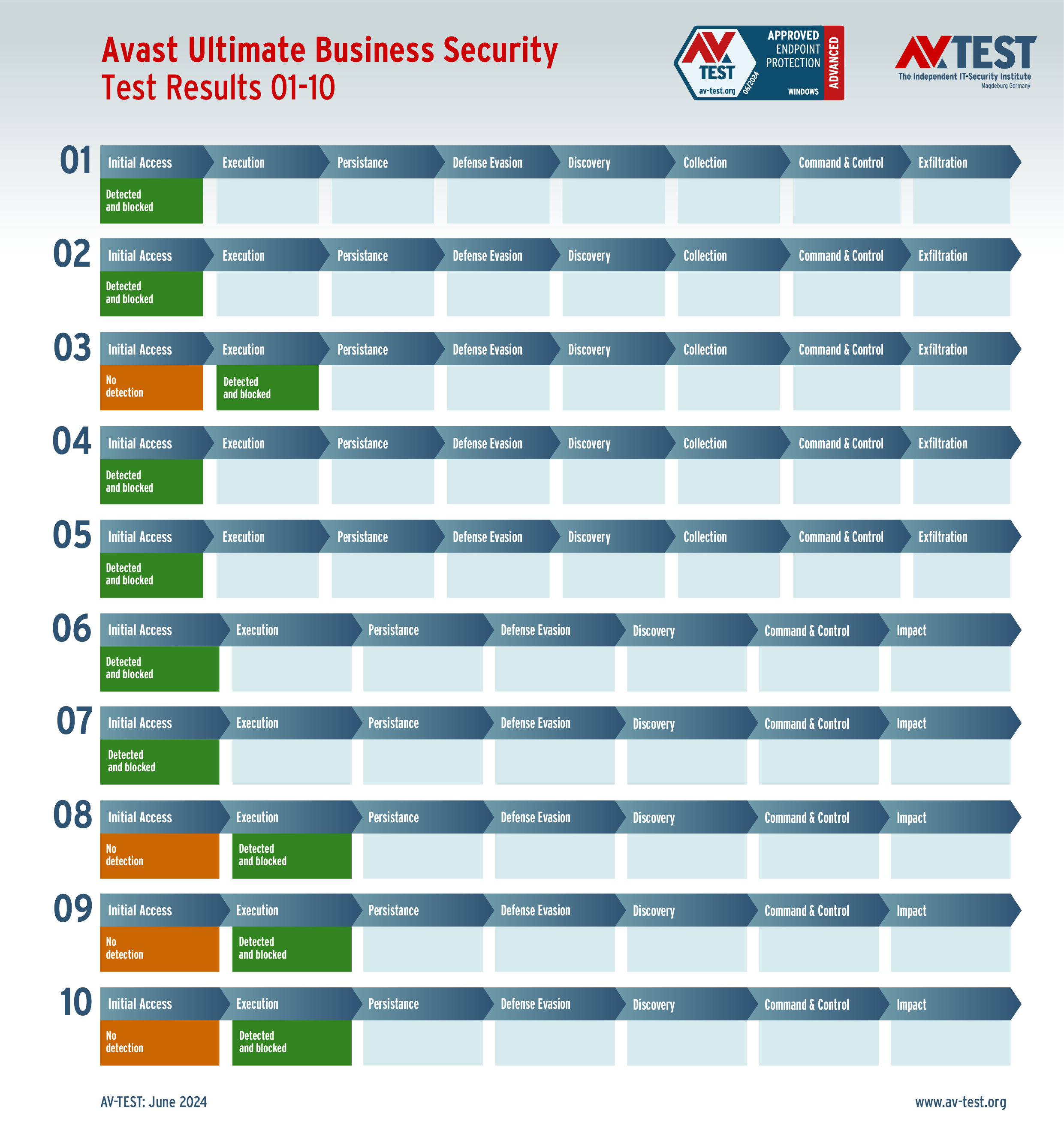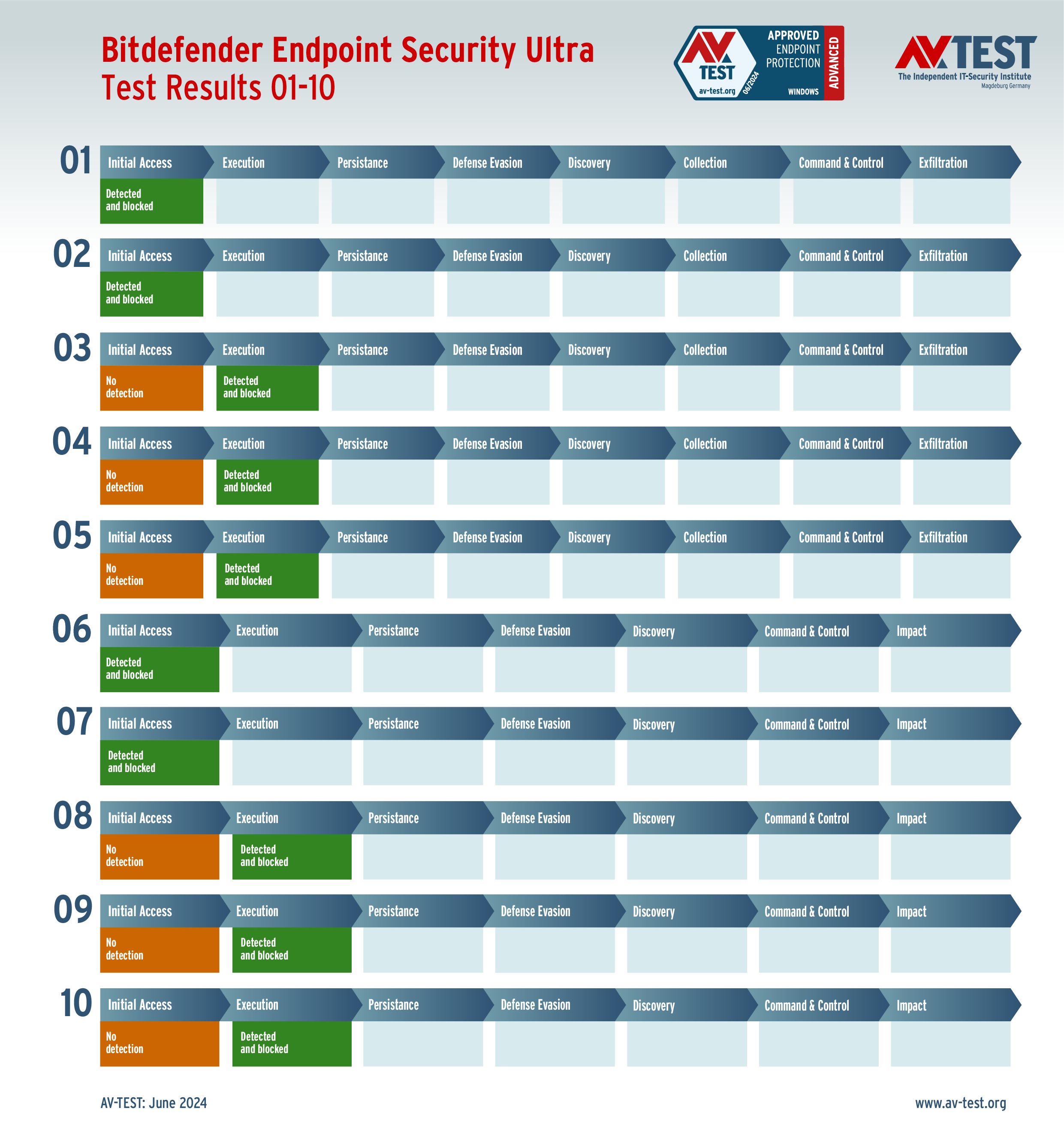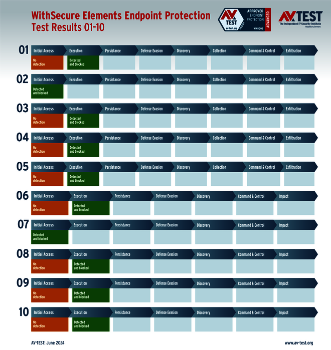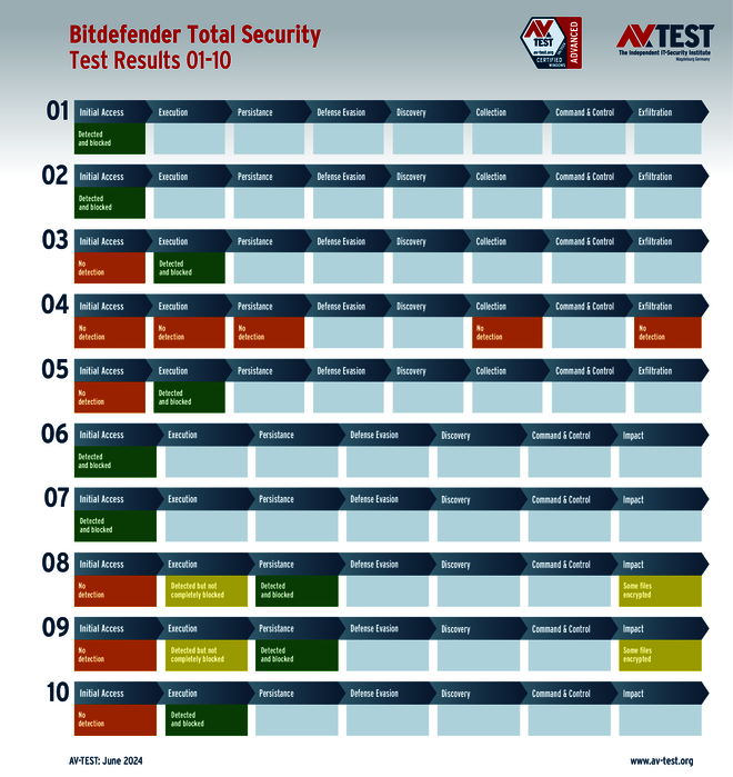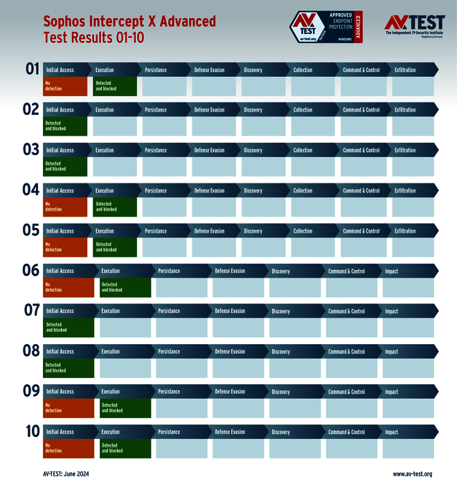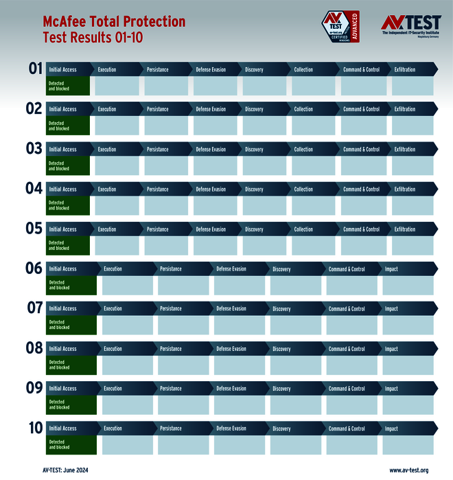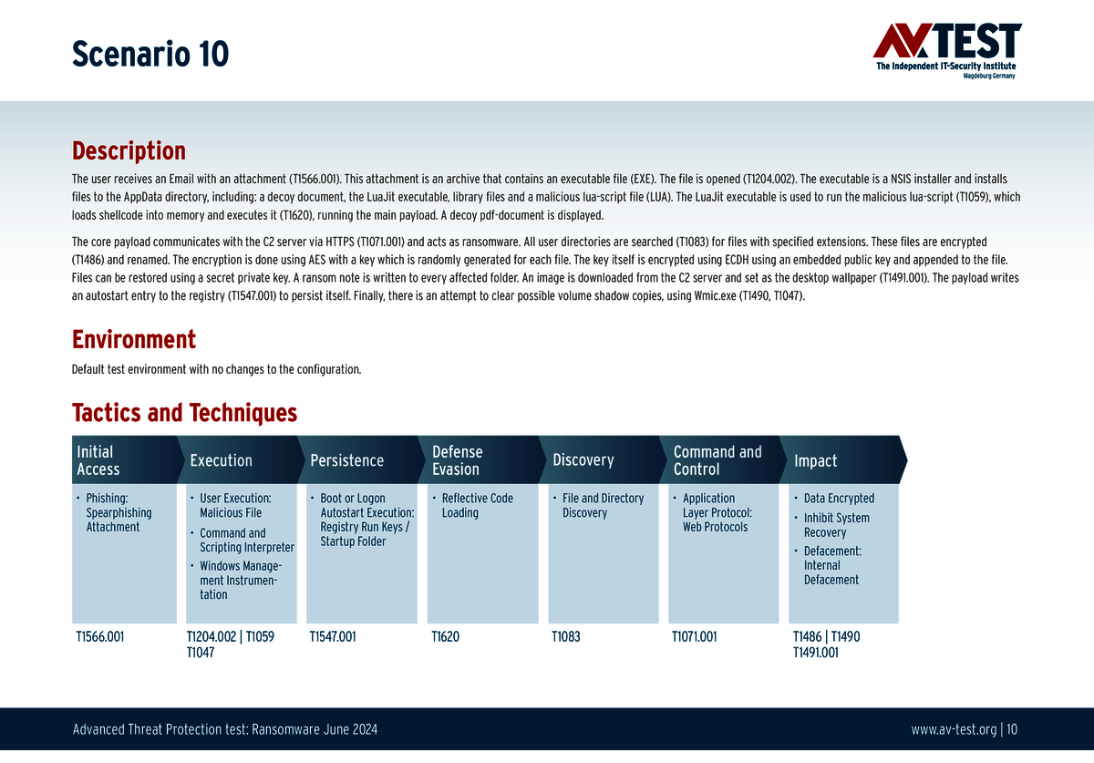 Im Test sind in den 10 realistischen Angriffsszenarien jeweils 5 aktuelle Ransomware-Exemplare und 5 Infostealer im Einsatz. Jede Malware nutzt eine andere Angriffstechnik oder kombiniert sogar verschiedene Techniken.