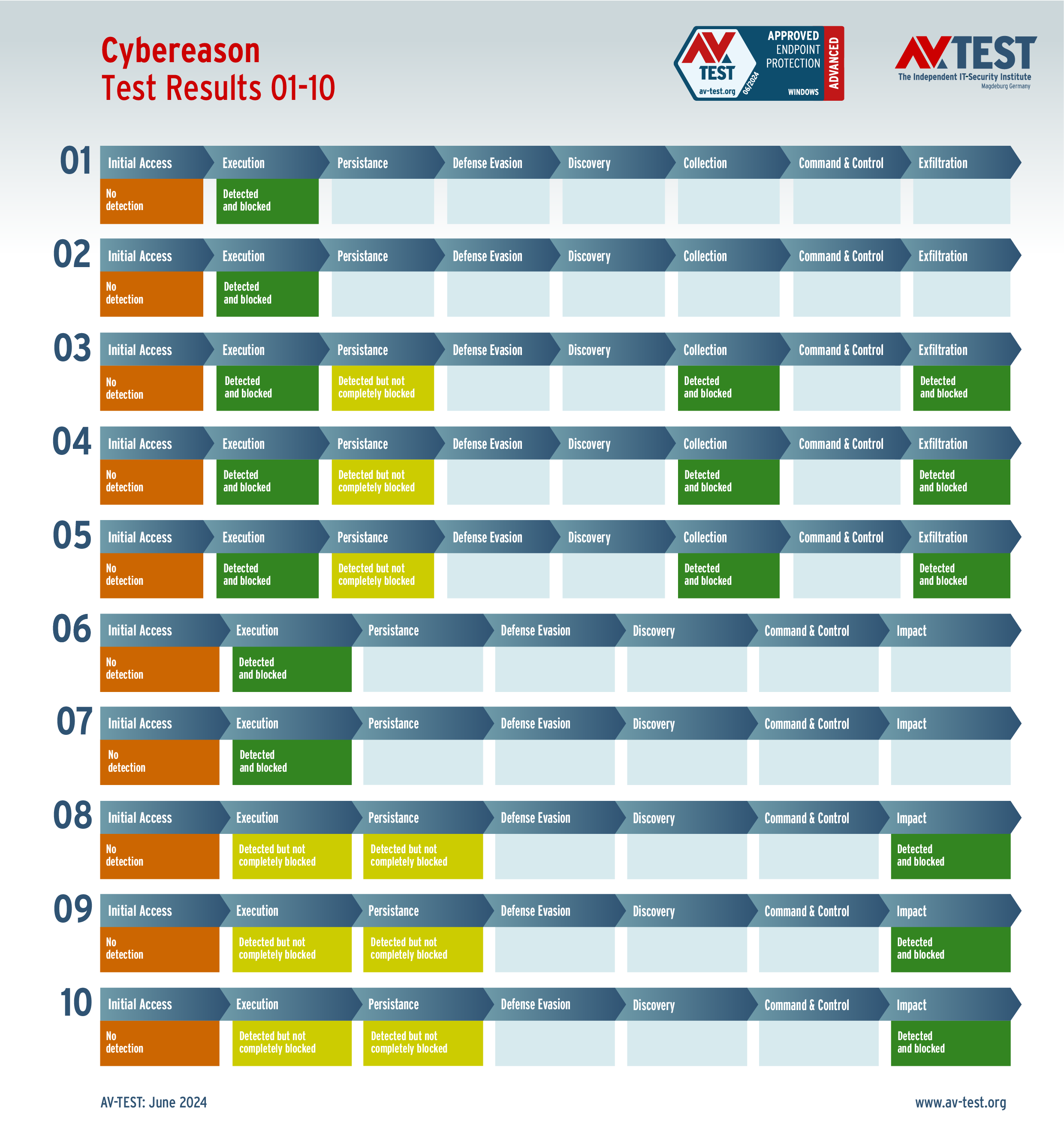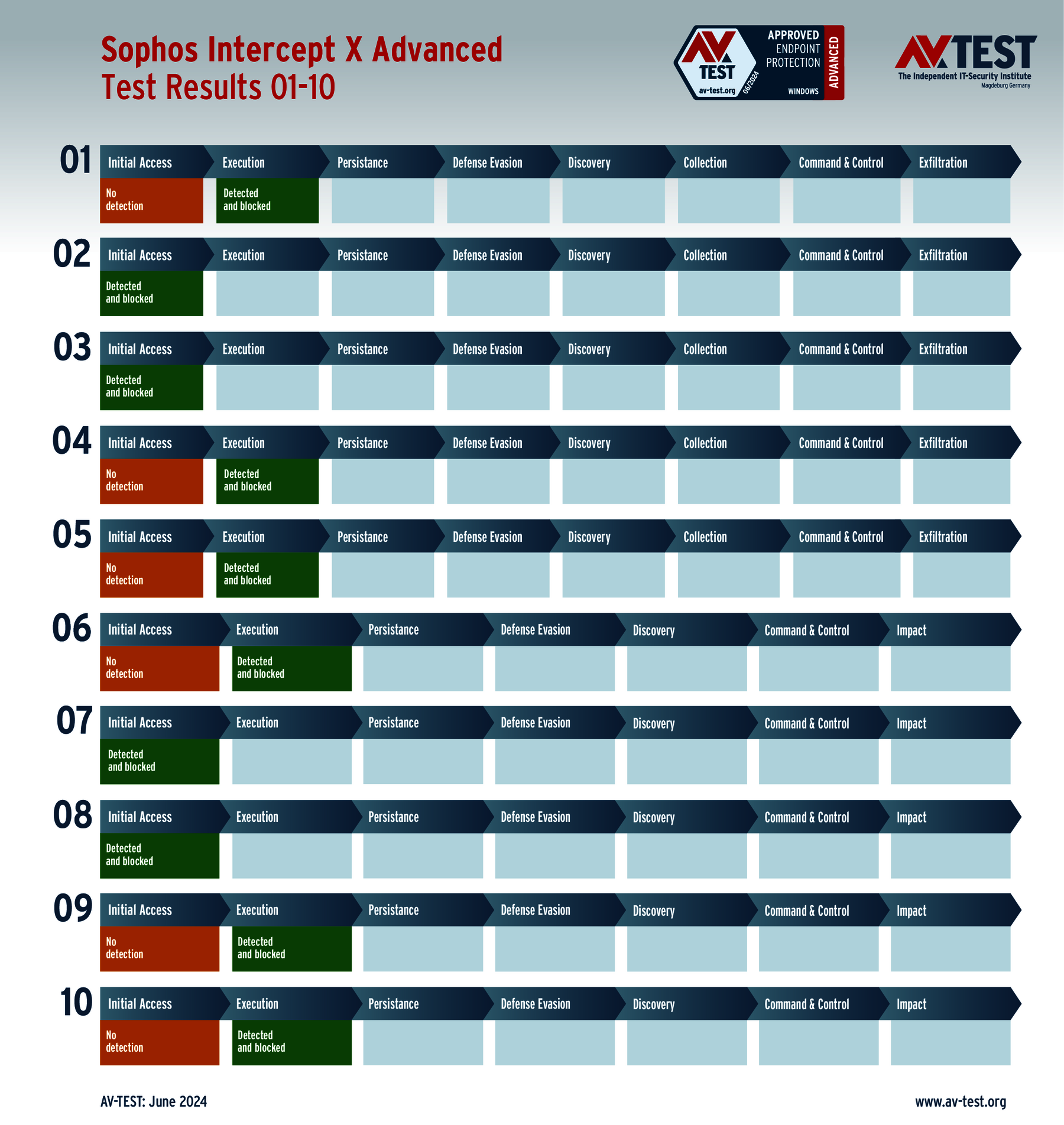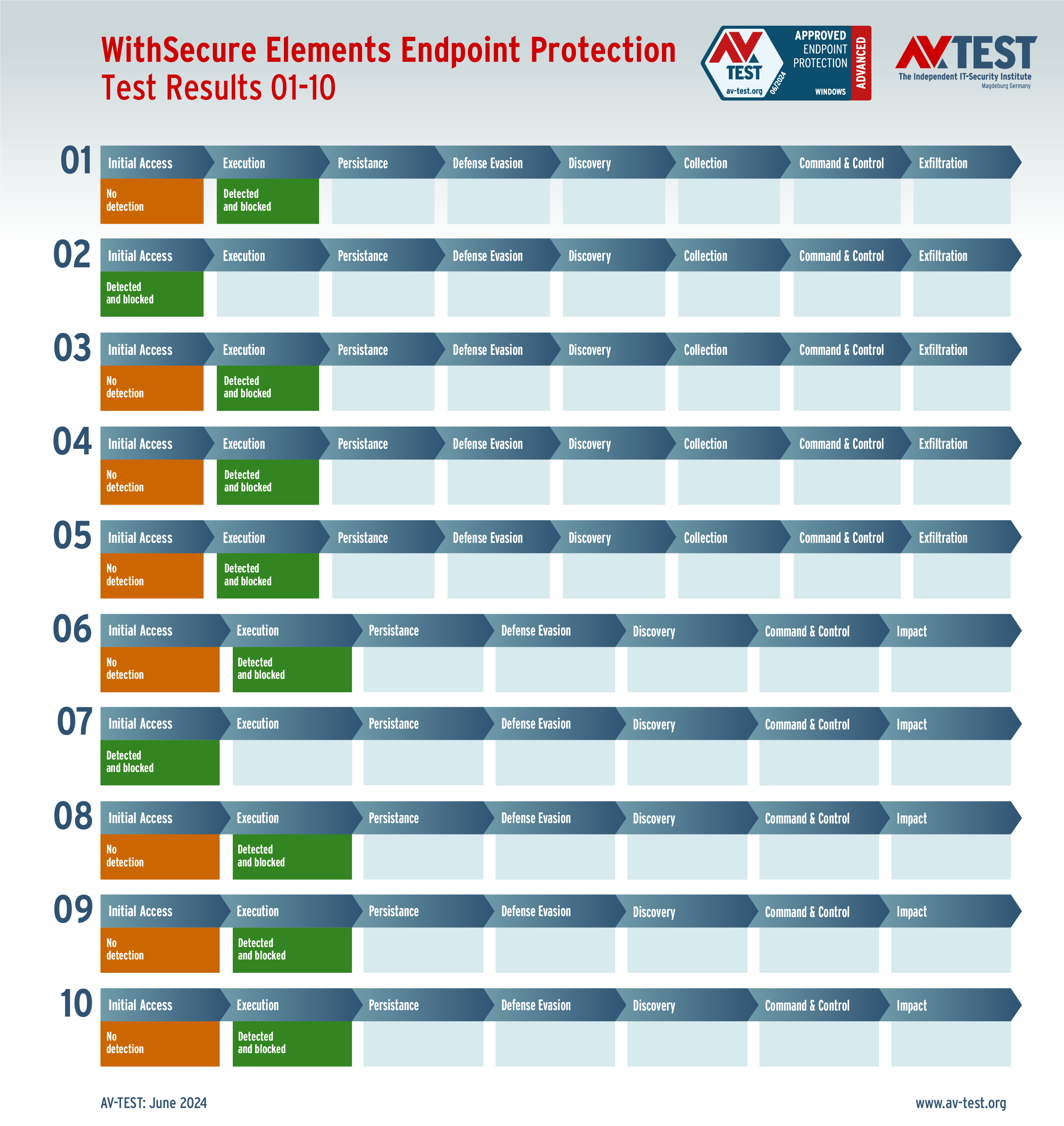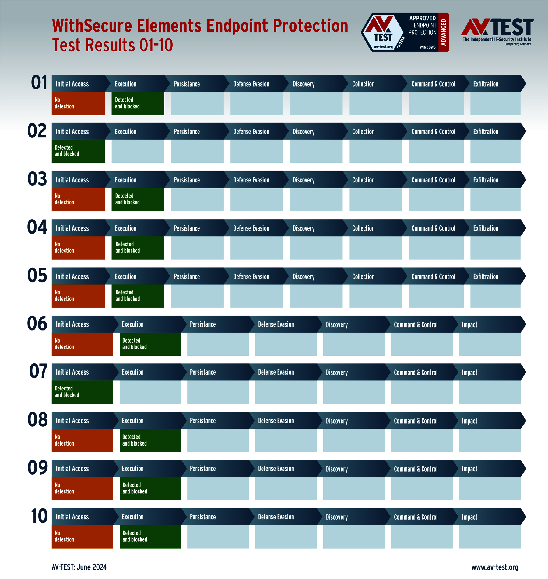 Im Test sind in den 10 realistischen Angriffsszenarien jeweils 5 aktuelle Ransomware-Exemplare und 5 Infostealer im Einsatz. Jede Malware nutzt eine andere Angriffstechnik oder kombiniert sogar verschiedene Techniken.