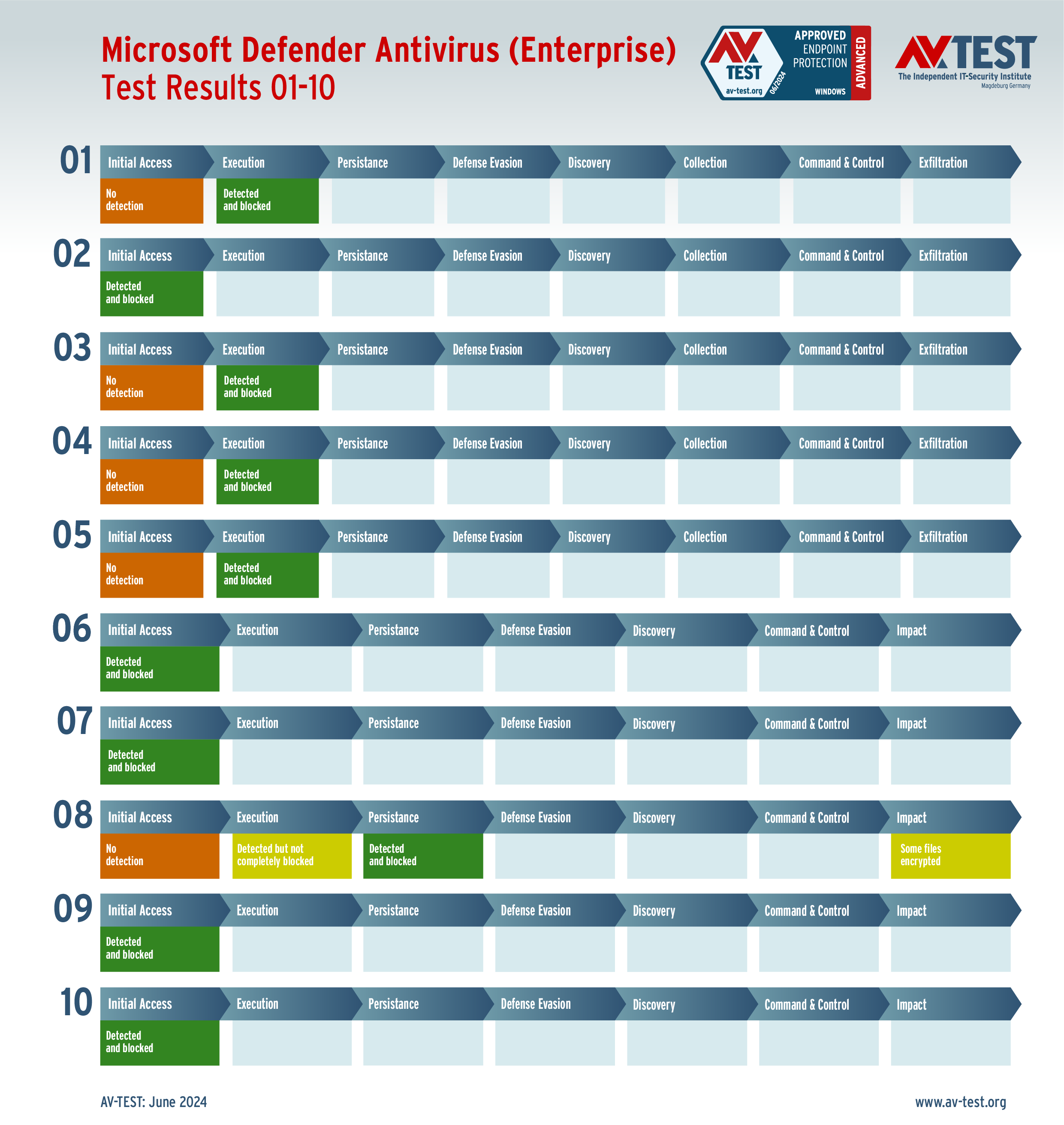 Der Test zeigt wieder einmal, wie dynamisch die Abwehr von Angreifern funktionieren kann. Selbst wenn eine Ransomware in Teile von Windows erfolgreich eindringt, ist das System noch nicht verloren. Der Test zeigt, dass die diversen Schutzmechanismen auch erst in späteren Schritten erfolgreich greifen. Bei den 17 untersuchten Produkten und den damit 170 ausgeführten Prüfszenarien gab es nur einen Fall, bei dem der Angreifer nicht erkannt und somit nicht aufgehalten wurde. In den anderen Prüfszenarien, bei denen die Malware zuerst nicht erkannt wurde, konnten die Abwehrprogramme in weiteren Schritten die Systeme erfolgreich verteidigen. Allerdings gibt es auch einige wenige Fälle, bei denen Daten zum Teil gestohlen oder auch vereinzelt verschlüsselt wurden.