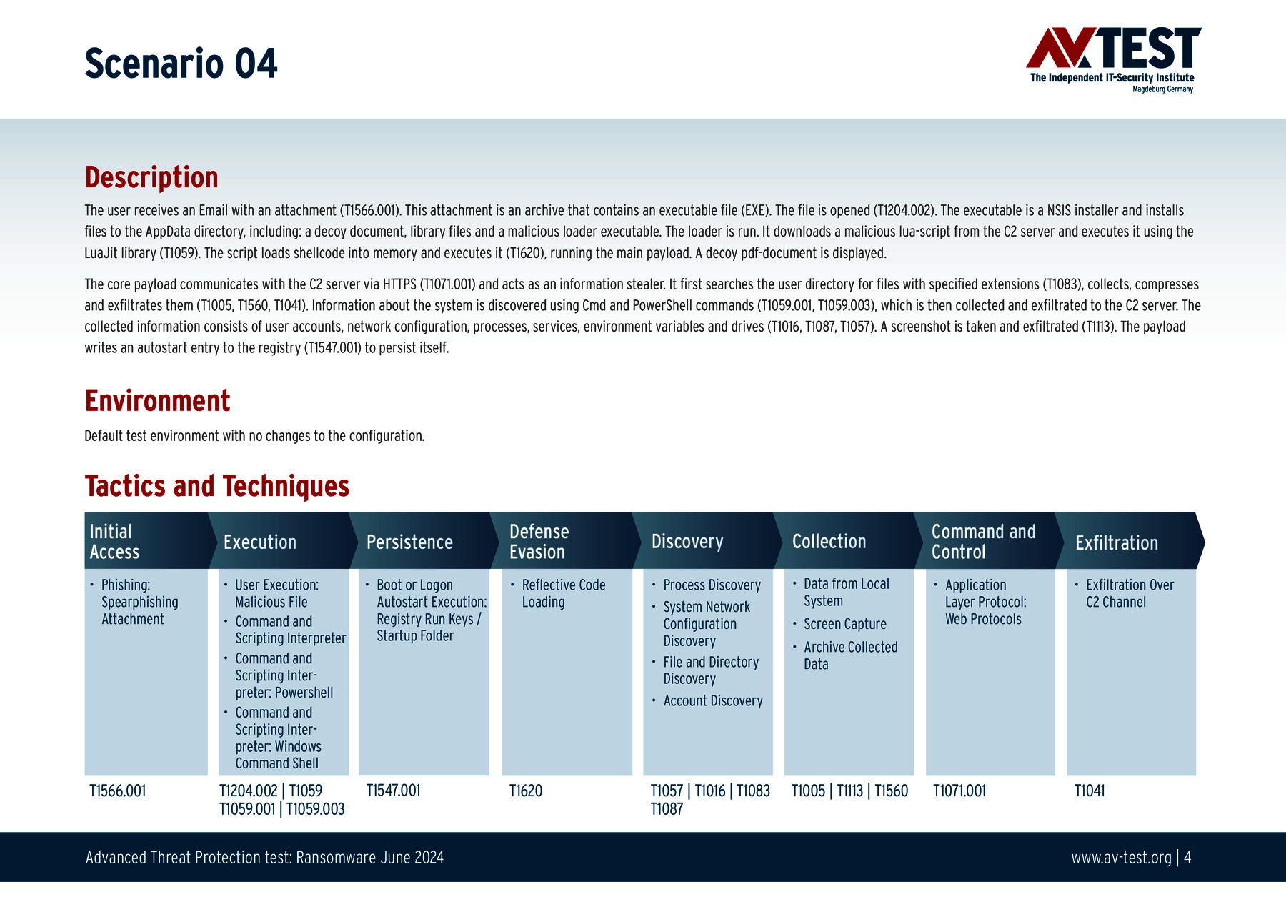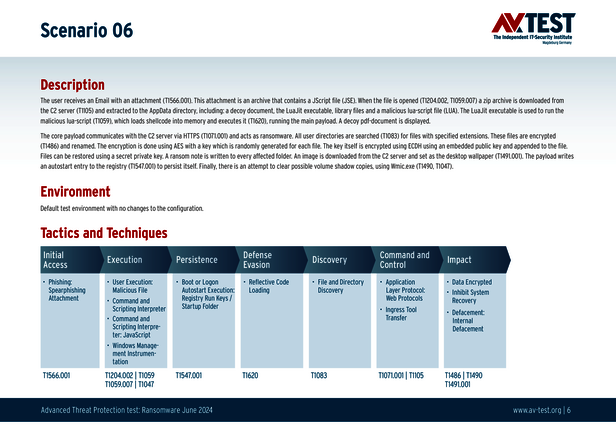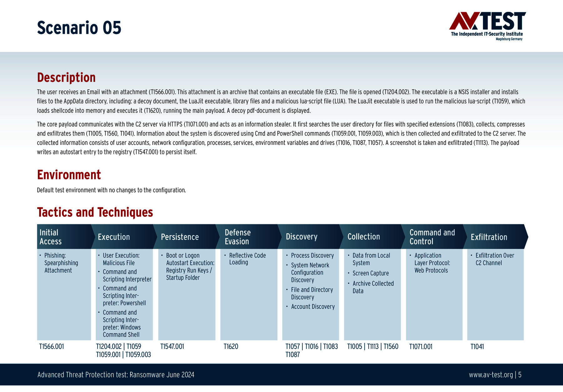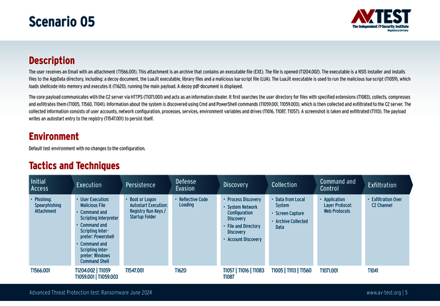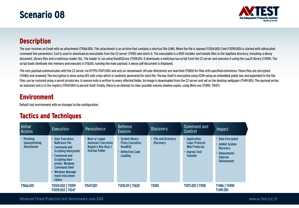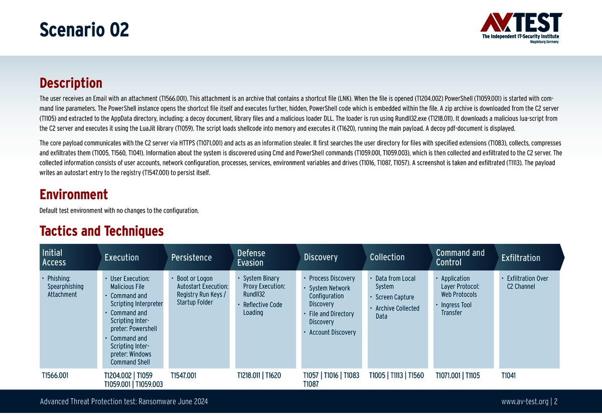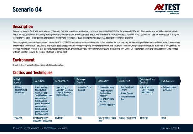 Alle Angriffsszenarien sind dokumentiert nach dem Standard der MITRE ATT&CK-Datenbank. Die einzelnen Unterpunkte, z.B. „T1566.001,“ stehen in der MITRE-Datenbank für „Techniques“ unter „Phishing: Spearphishing Attachment“. Jeder Testschritt ist so unter Fachleuten definiert und lässt sich nachvollziehen. Zusätzlich sind alle Angriffstechniken erklärt und wie dabei die Malware zum Zuge kommt.