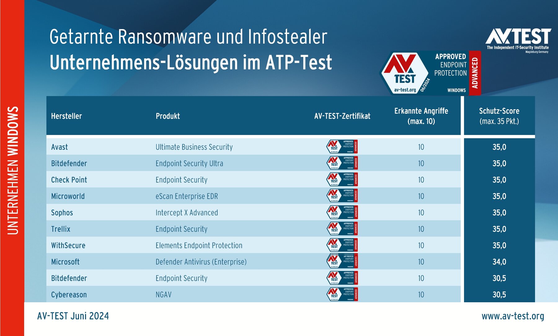 Auch bei den Lösungen für Unternehmen ist das Ergebnis durchmischt. 7 der 10 im ATP-Test geprüften Produkte arbeiten in allen 10 Szenarien fehlerfrei und erhalten den Höchstwert von je 35 Punkten für ihren Schutz-Score. Sie kommen von Avast, Bitdefender (Version Endpoint Security Ultra), Check Point, Microworld, Sophos, Trellix und WithSecure.