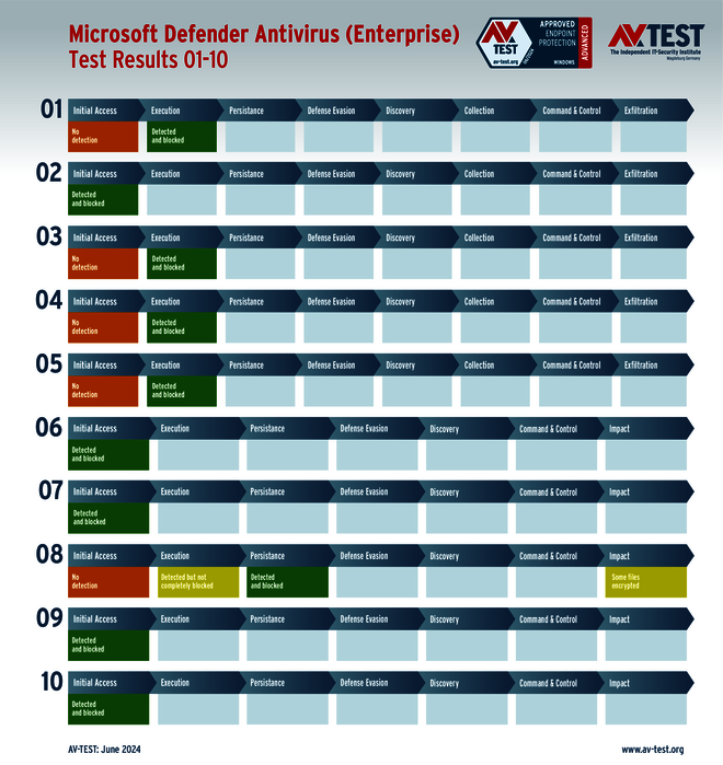 Microsoft Defender Antivirus (Enterprise) hat das Problem, dass es einen Ransomware-Angriff zwar erkennt, aber nicht komplett stoppen kann. Das Problem zieht sich durch bis zum Ende, an dem dann einzelne Dateien verschlüsselt sind. Damit bleiben 34 von 35 Punkten.