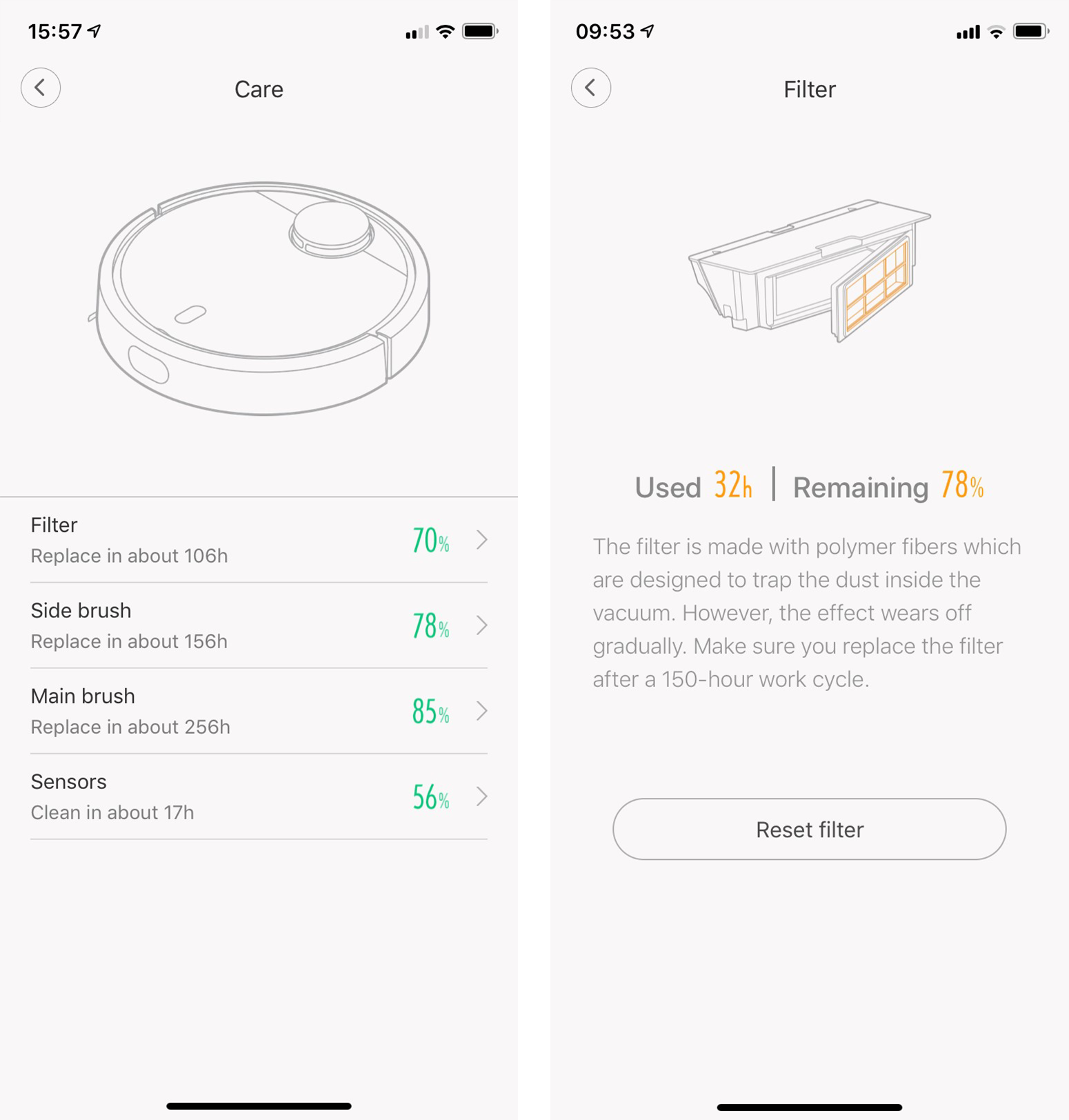 Beim Einsatz erfassen die Robotersauger aber nicht nur Umgebungsdaten oder Informationen über ihre Nutzer. Die Geräte überprüfen beispielsweise auch den Zustand der eigenen Sensoren sowie von Verschleißteilen, die regelmäßig gewechselt werden müssen. Dazu gehören etwa Luftfilter, Seiten- und Hauptbürste. Nach einer bestimmten Anzahl von Saugfahrten informieren die Geräte den Nutzer über nötige Wechsel. Eigentlich ist das als sinnvolles Feature zu sehen, um die Leistungsfähigkeit des Gerätes zu erhalten. Allerdings können Hersteller damit auch überprüfen, ob Nutzer die Roboter so einsetzen, wie es die Garantiebedingungen vorschreiben. Werden Abweichungen festgestellt und an den Hersteller übermittelt, könnte dieser, je nach Gesetzeslage des Verkaufslandes, möglicherweise eine Garantie ausschließen. Abgesehen davon werden sich Nutzer zukünftig eventuell sogar daran gewöhnen müssen, dass ihr Staubsauger per Chat-Nachricht neue Luftfilter verlangt oder gleich selbst eine neue Hauptbürste im Onlinehandel bestellt.