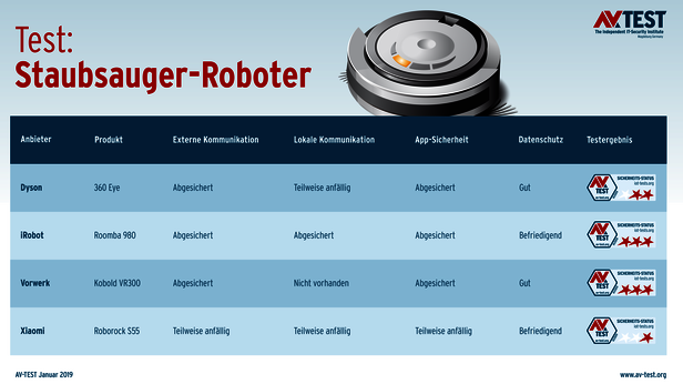 2002 fegte mit dem Modell Roomba von Hersteller iRobot der erste kommerziell erfolgreiche „Robovac“ über den roten Teppich. Der US-Hersteller, der sich zugutehalten kann, Robo-Sauger weltweit etabliert zu haben, hält nach wie vor über 50 Prozent des globalen Marktes. Doch gerade im höheren Preissegment sind mittlerweile auch die klassischen Staubsauger-Vertreter mit selbst entwickelter oder oft auch zugekaufter Technik vertreten. Die IoT-Experten des AV-TEST Instituts nahmen die Sicherheit der internen WLAN-Kommunikation, den Datenverkehr angebundener Cloud-Dienste, die Sicherheit der zugehörigen Apps sowie die Datenschutzbestimmungen der folgenden vier High-End-Sauger unter die Lupe: